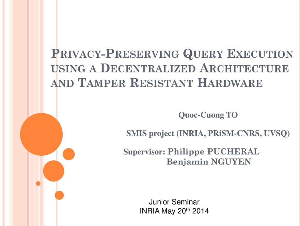 Privacy-Preserving Query Execution using a Decentralized Architecture and Tamper Resistant Hardware Quoc-Cuong TO SMIS project (INRIA, PRiSM-CNRS, UVSQ) Supervisor: Philippe PUCHERALBenjamin NGUYEN Junior Seminar INRIA May 20th 2014
