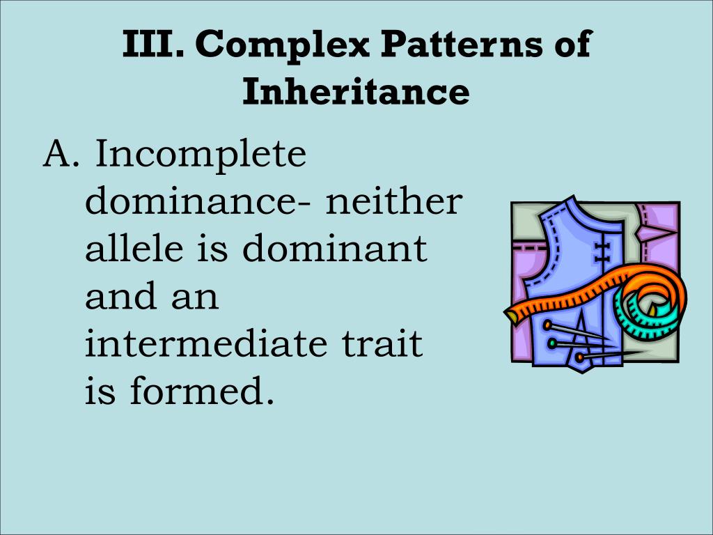 III. Complex Patterns of Inheritance A. Incomplete dominance- neither allele is dominant and an intermediate trait is formed.