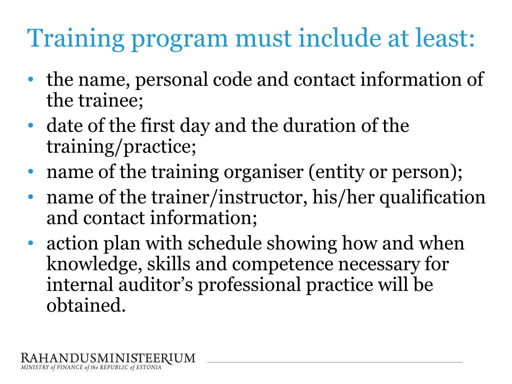 Training program must include at least: • the name, personal code and contact information of the trainee; • date of the first day and the duration of the training/practice; • name of the training organiser (entity or person); • name of the trainer/instructor, his/her qualification and contact information; • action plan with schedule showing how and when knowledge, skills and competence necessary for internal auditor’s professional practice will be obtained.