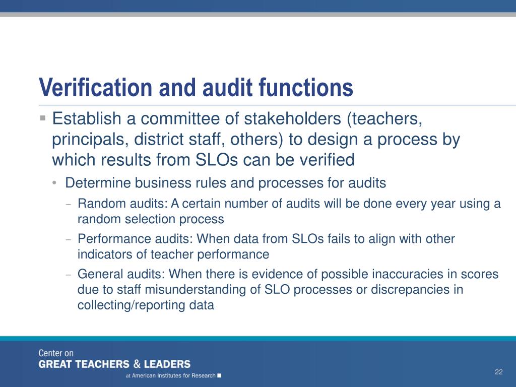 Verification and audit functions • Establish a committee of stakeholders (teachers, principals, district staff, others) to design a process by which results from SLOs can be verified • Determine business rules and processes for audits • Random audits: A certain number of audits will be done every year using a random selection process • Performance audits: When data from SLOs fails to align with other indicators of teacher performance • General audits: When there is evidence of possible inaccuracies in scores due to staff misunderstanding of SLO processes or discrepancies in collecting/reporting data