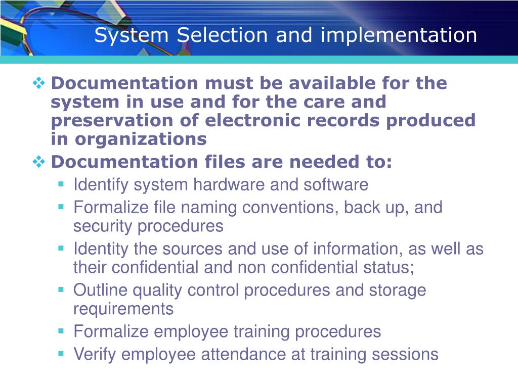 System Selection and implementation • Documentation must be available for the system in use and for the care and preservation of electronic records produced in organizations • Documentation files are needed to: • Identify system hardware and software • Formalize file naming conventions, back up, and security procedures • Identity the sources and use of information, as well as their confidential and non confidential status; • Outline quality control procedures and storage requirements • Formalize employee training procedures • Verify employee attendance at training sessions