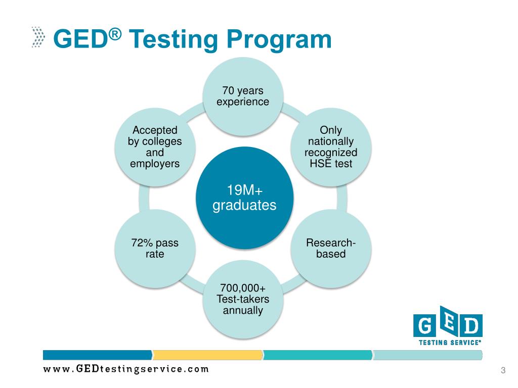The new GED® Test: Key facts • LAUNCH: • January 2, 2014 • Delivered by computer in secure testing centers • CONTENT: • Aligned with career- and college-readiness content most closely linked to career and postsecondary success • Four content area sections rather than five • “Passing Standard” – represents high school equivalency, reflecting actual performance of 2013 graduating high school seniors • The 2014 GED Test will also provide more information about academic knowledge and skills deemed critical by employers and colleges – College and Career-Readiness targets Launch Platform Content Performance Standards