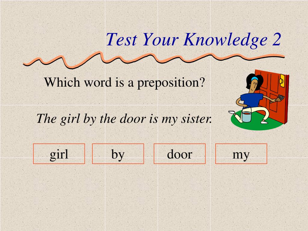 Test Your Knowledge 2 Which word is a preposition? The girl by the door is my sister. girl by door my