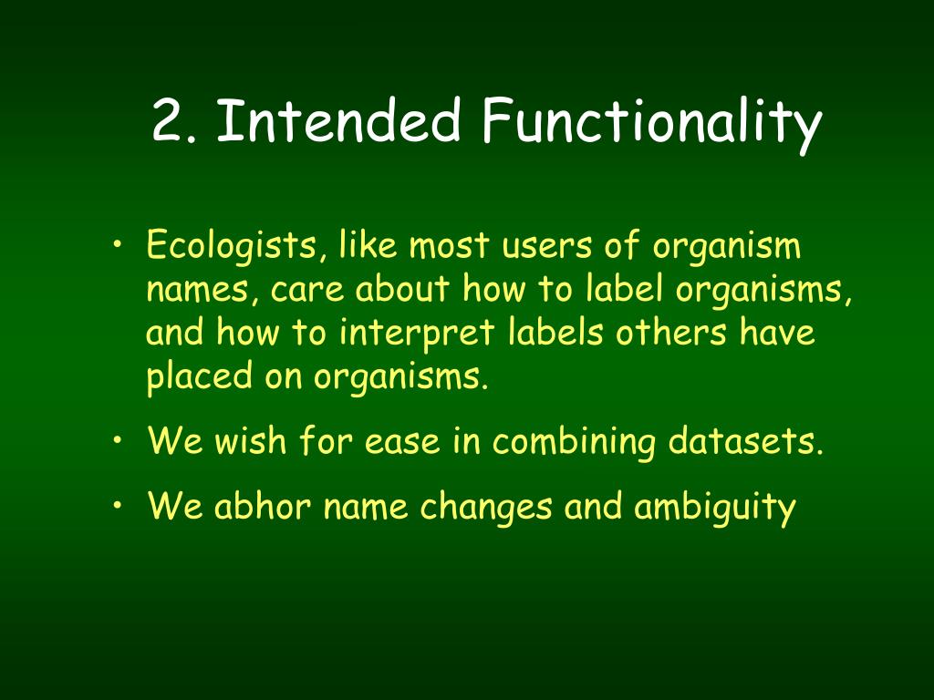 2. Intended Functionality • Ecologists, like most users of organism names, care about how to label organisms, and how to interpret labels others have placed on organisms. • We wish for ease in combining datasets. • We abhor name changes and ambiguity