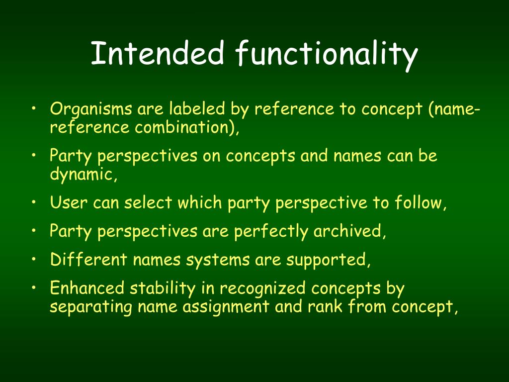 Intended functionality • Organisms are labeled by reference to concept (name-reference combination), • Party perspectives on concepts and names can be dynamic, • User can select which party perspective to follow, • Party perspectives are perfectly archived, • Different names systems are supported, • Enhanced stability in recognized concepts by separating name assignment and rank from concept,