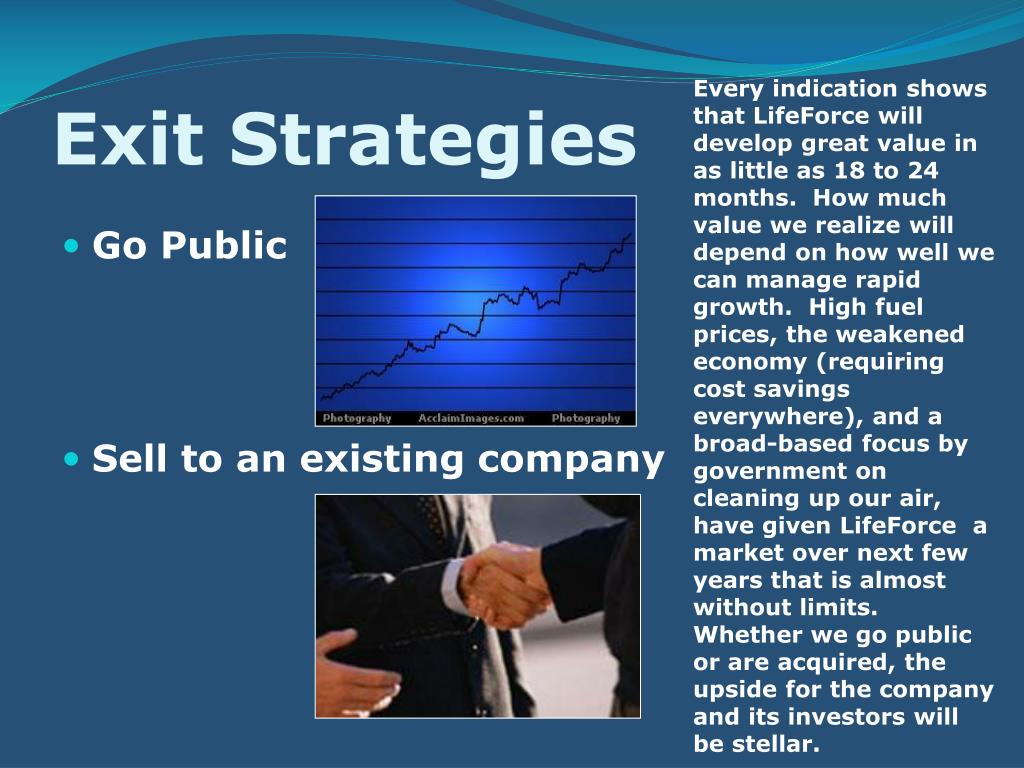 Every indication shows that LifeForce will develop great value in as little as 18 to 24 months. How much value we realize will depend on how well we can manage rapid growth. High fuel prices, the weakened economy (requiring cost savings everywhere), and a broad-based focus by government on cleaning up our air, have given LifeForce a market over next few years that is almost without limits. Whether we go public or are acquired, the upside for the company and its investors will be stellar. Exit Strategies • Go Public • Sell to an existing company