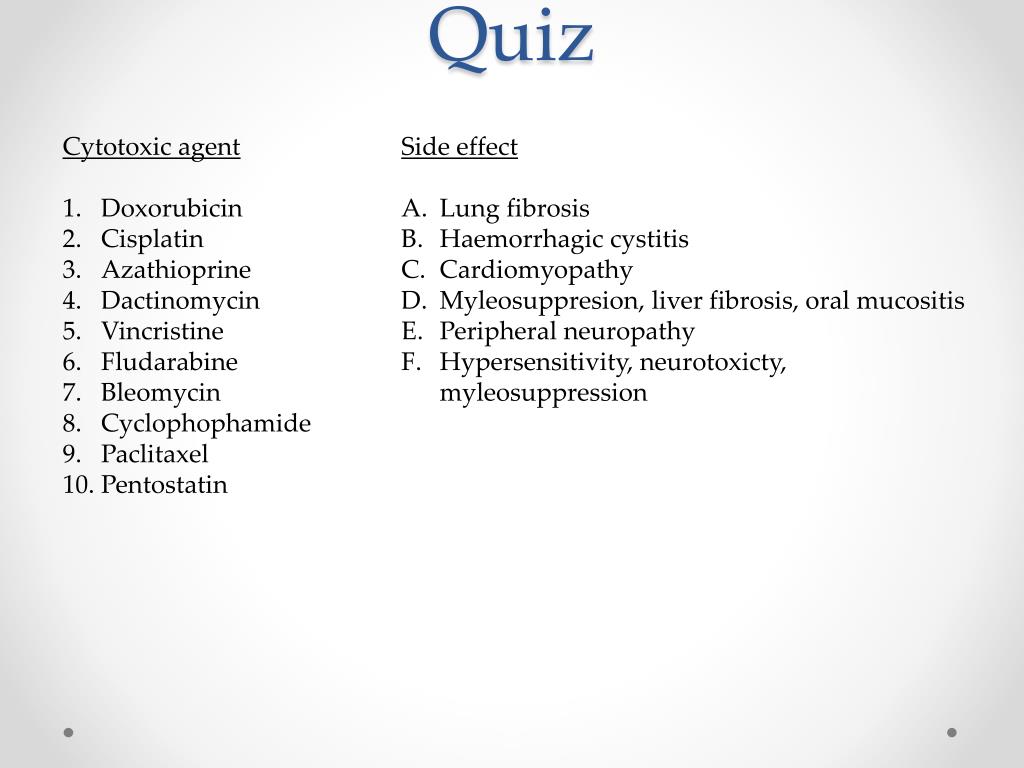 Quiz Cytotoxic agent Doxorubicin Cisplatin Azathioprine Dactinomycin Vincristine Fludarabine Bleomycin Cyclophophamide Paclitaxel Pentostatin Side effect Lung fibrosis Haemorrhagic cystitis Cardiomyopathy Myleosuppresion, liver fibrosis, oral mucositis Peripheral neuropathy Hypersensitivity, neurotoxicty, myleosuppression
