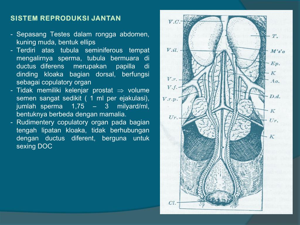 SISTEM REPRODUKSI JANTAN • Sepasang Testes dalamrongga abdomen, kuningmuda, bentukellips • Terdiriatastubulaseminiferoustempatmengalirnyasperma, tubulabermuaradiductusdiferensmerupakan papilla didindingkloakabagian dorsal, berfungsisebagaicopulatory organ • Tidakmemilikikelenjarprostat volume semen sangatsedikit ( 1 ml per ejakulasi), jumlahsperma 1,75 – 3 milyard/ml, bentuknyaberbedadenganmamalia. • Rudimenterycopulatory organ padabagiantengahlipatankloaka, tidakberhubungandenganductusdiferent, bergunauntuk sexing DOC