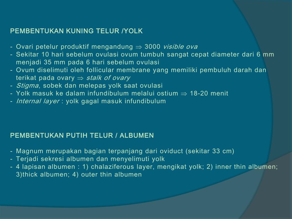 PEMBENTUKAN KUNING TELUR /YOLK • Ovaripetelurproduktifmengandung 3000 visible ova • Sekitar 10 harisebelumovulasi ovum tumbuhsangatcepat diameter dari 6 mm menjadi 35 mm pada 6 harisebelumovulasi • Ovum diselimutioleh follicular membrane yang memilikipembuluhdarahdanterikatpada ovary stalk of ovary • Stigma, sobekdanmelepas yolk saatovulasi • Yolk masukkedalaminfundibulummelaluiostium 18-20 menit • Internal layer : yolk gagalmasukinfundibulum • PEMBENTUKAN PUTIH TELUR / ALBUMEN • Magnum merupakanbagianterpanjangdari oviduct (sekitar 33 cm) • Terjadisekresi albumen danmenyelimuti yolk • 4 lapisan albumen : 1) chalaziferous layer, mengikat yolk; 2) inner thin albumen; 3)thick albumen; 4) outer thin albumen