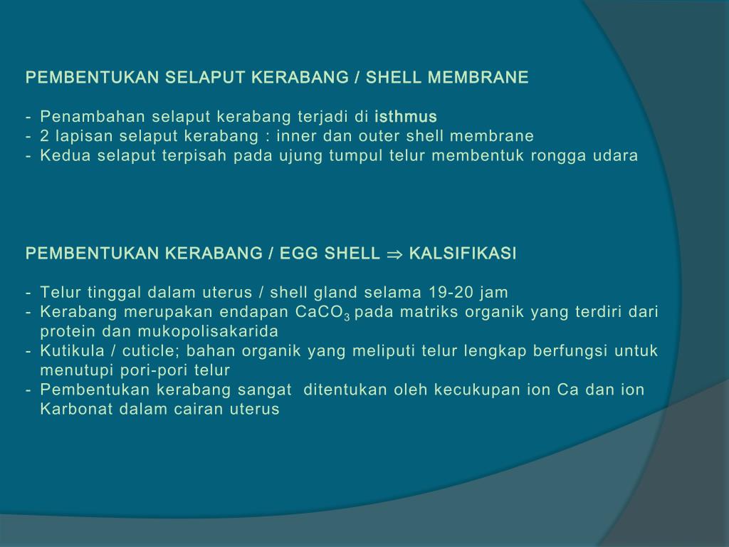 Kerabang Klasifikasikerabangtelurdimulaisebelumtelurmasuk uterus Klalsiumkarbonatkerabangdibentukbila ion kalsiumdilengkapimelaluipasokandarah Ion karbonatberasaldaridarahdankelenjarkerabang Penguranganpasokandancampurandarahdenganpenimbunan CaCO3 darikerabangtelurmenyebabkankualitaskerabangturun, temperaturlingkunganygtinggimenyebabkankerabangtelurberkualitasrendah