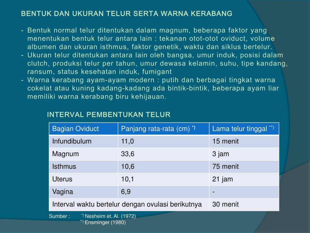 BENTUK DAN UKURAN TELUR SERTA WARNA KERABANG • Bentuk normal telurditentukandalam magnum, beberapafaktor yang menentukanbentuktelurantara lain : tekananotot-otot oviduct, volume albumen danukuran isthmus, faktorgenetik, waktudansiklusbertelur. • Ukurantelurditentukanantara lain olehbangsa, umurinduk, posisidalam clutch, produksitelur per tahun, umurdewasakelamin, suhu, tipekandang, ransum, status kesehataninduk, fumigant • Warnakerabangayam-ayam modern : putihdanberbagaitingkatwarnacokelatataukuningkadang-kadangadabintik-bintik, beberapaayam liar memilikiwarnakerabangbirukehijauan. • INTERVAL PEMBENTUKAN TELUR Sumber : *) Nesheim et. Al. (1972) **) Ensminger (1980)