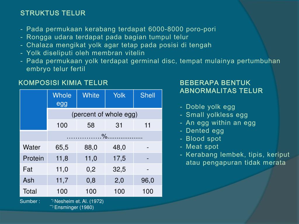 STRUKTUS TELUR • Padapermukaankerabangterdapat 6000-8000 poro-pori • Ronggaudaraterdapatpadabagiantumpultelur • Chalazamengikat yolk agar tetappadaposisiditengah • Yolk diseliputiolehmembranvitelin • Padapermukaan yolk terdapat germinal disc, tempatmulainyapertumbuhan embryo telurfertil • KOMPOSISI KIMIA TELUR • BEBERAPA BENTUK ABNORMALITAS TELUR • Doble yolk egg • Small yolkless egg • An egg within an egg • Dented egg • Blood spot • Meat spot • Kerabanglembek, tipis, keriputataupengapurantidakmerata Sumber : *) Nesheim et. Al. (1972) **) Ensminger (1980)