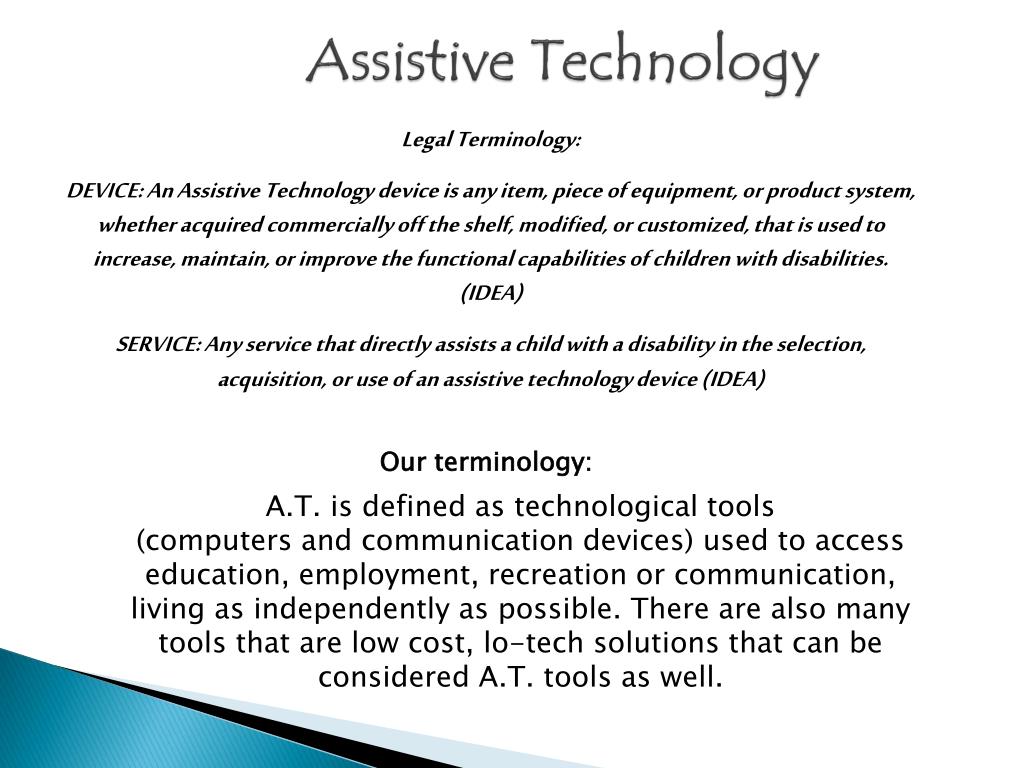 Assistive Technology Legal Terminology: DEVICE: An Assistive Technology device is any item, piece of equipment, or product system, whether acquired commercially off the shelf, modified, or customized, that is used to increase, maintain, or improve the functional capabilities of children with disabilities. (IDEA) SERVICE: Any service that directly assists a child with a disability in the selection, acquisition, or use of an assistive technology device (IDEA) Our terminology: A.T. is defined as technological tools (computers and communication devices) used to access education, employment, recreation or communication, living as independently as possible. There are also many tools that are low cost, lo-tech solutions that can be considered A.T. tools as well.