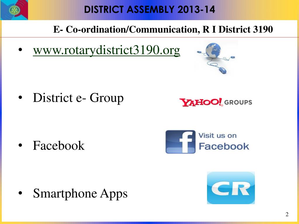 E- Co-ordination/Communication, R I District 3190 • www.rotarydistrict3190.org • District e- Group • Facebook • Smartphone Apps
