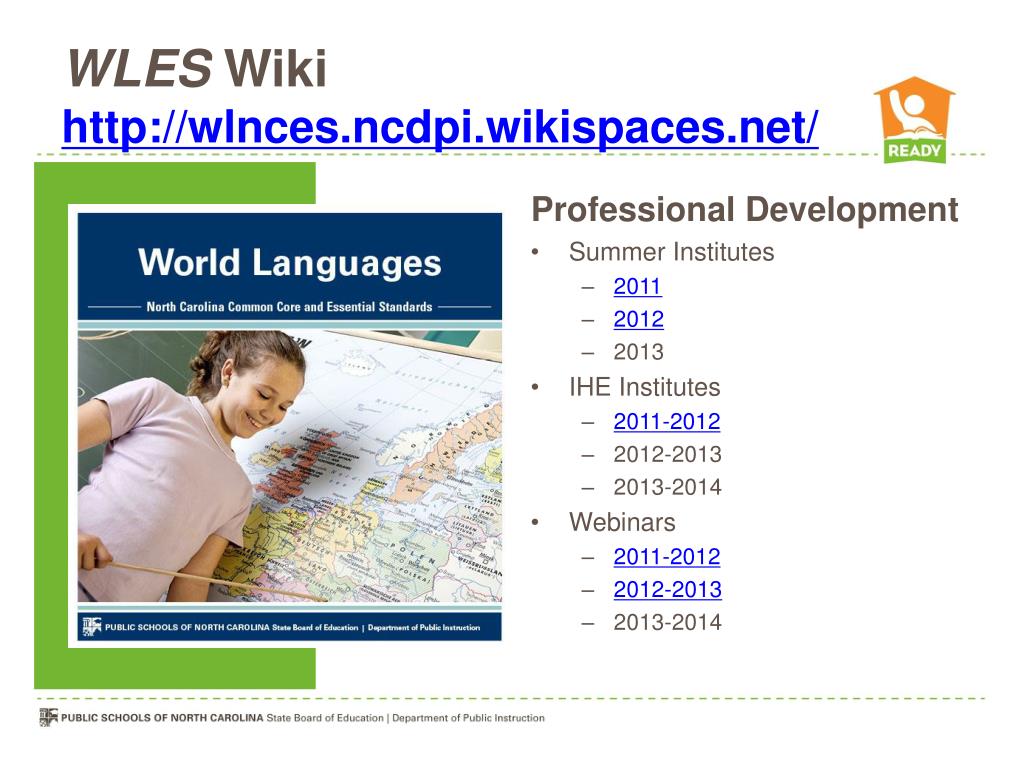 WLES Wikihttp://wlnces.ncdpi.wikispaces.net/ Professional Development Summer Institutes 2011 2012 2013 IHE Institutes 2011-2012 2012-2013 2013-2014 Webinars 2011-2012 2012-2013 2013-2014
