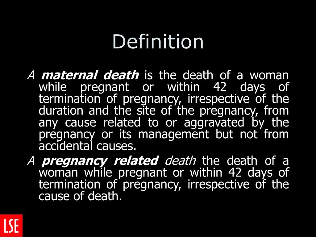 Definition A maternal death is the death of a woman while pregnant or within 42 days of termination of pregnancy, irrespective of the duration and the site of the pregnancy, from any cause related to or aggravated by the pregnancy or its management but not from accidental causes. A pregnancy related deaththe death of a woman while pregnant or within 42 days of termination of pregnancy, irrespective of the cause of death.
