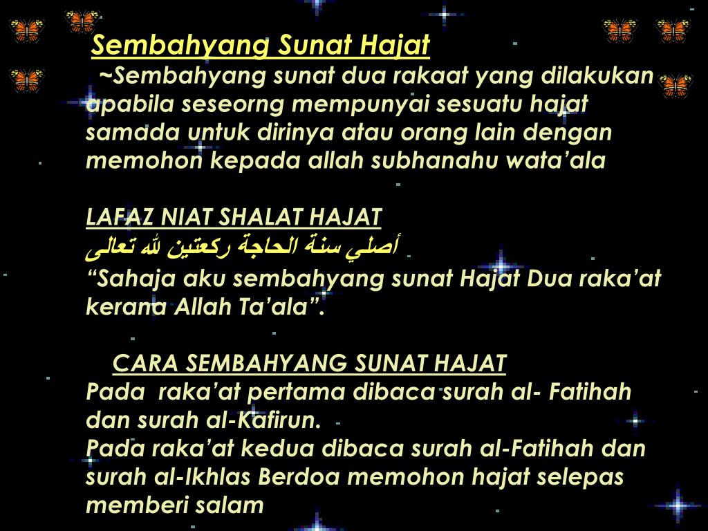Sembahyang Sunat Hajat ~Sembahyang sunat dua rakaat yang dilakukan apabila seseorng mempunyai sesuatu hajat samada untuk dirinya atau orang lain dengan memohon kepada allah subhanahu wata’ala LAFAZ NIAT SHALAT HAJAT أصلي سنة الحاجة ركعتين لله تعالى “Sahaja aku sembahyang sunat Hajat Dua raka’at kerana Allah Ta’ala”. CARA SEMBAHYANG SUNAT HAJAT Pada raka’at pertama dibaca surah al- Fatihah dan surah al-Kafirun. Pada raka’at kedua dibaca surah al-Fatihah dan surah al-Ikhlas Berdoa memohon hajat selepas memberi salam