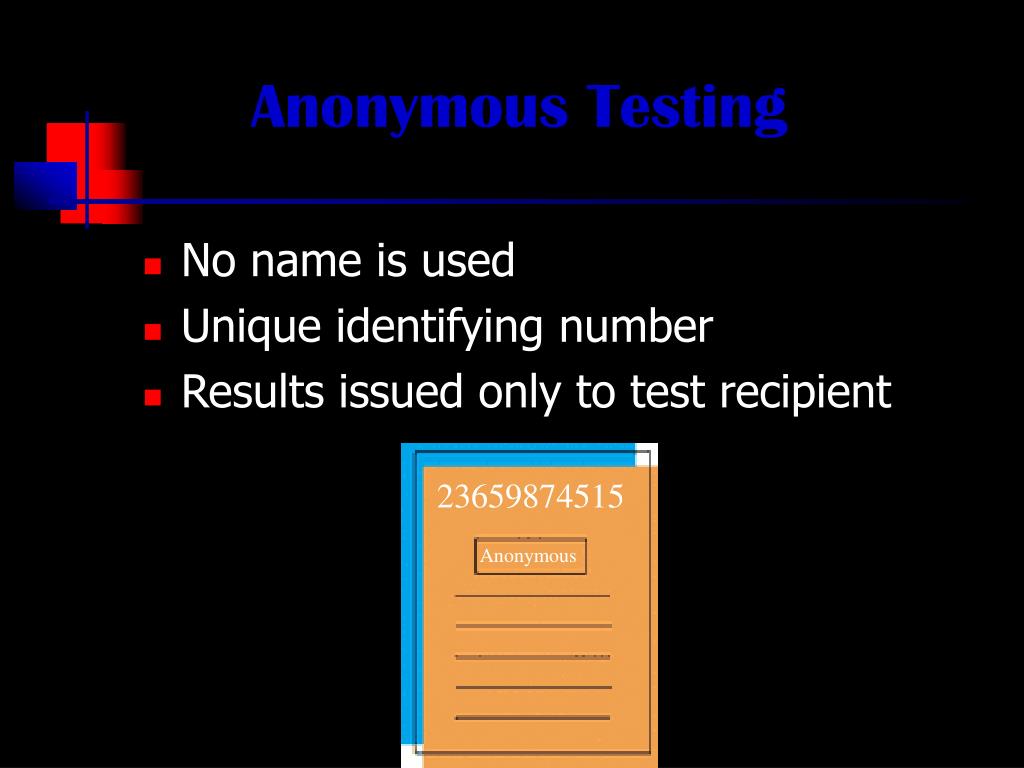 Confidential Testing • Person’s name is recorded along with HIV results • Name and positive results are reported to the State Department and the Centers for Disease Control and Prevention • Results issued only to test recipient