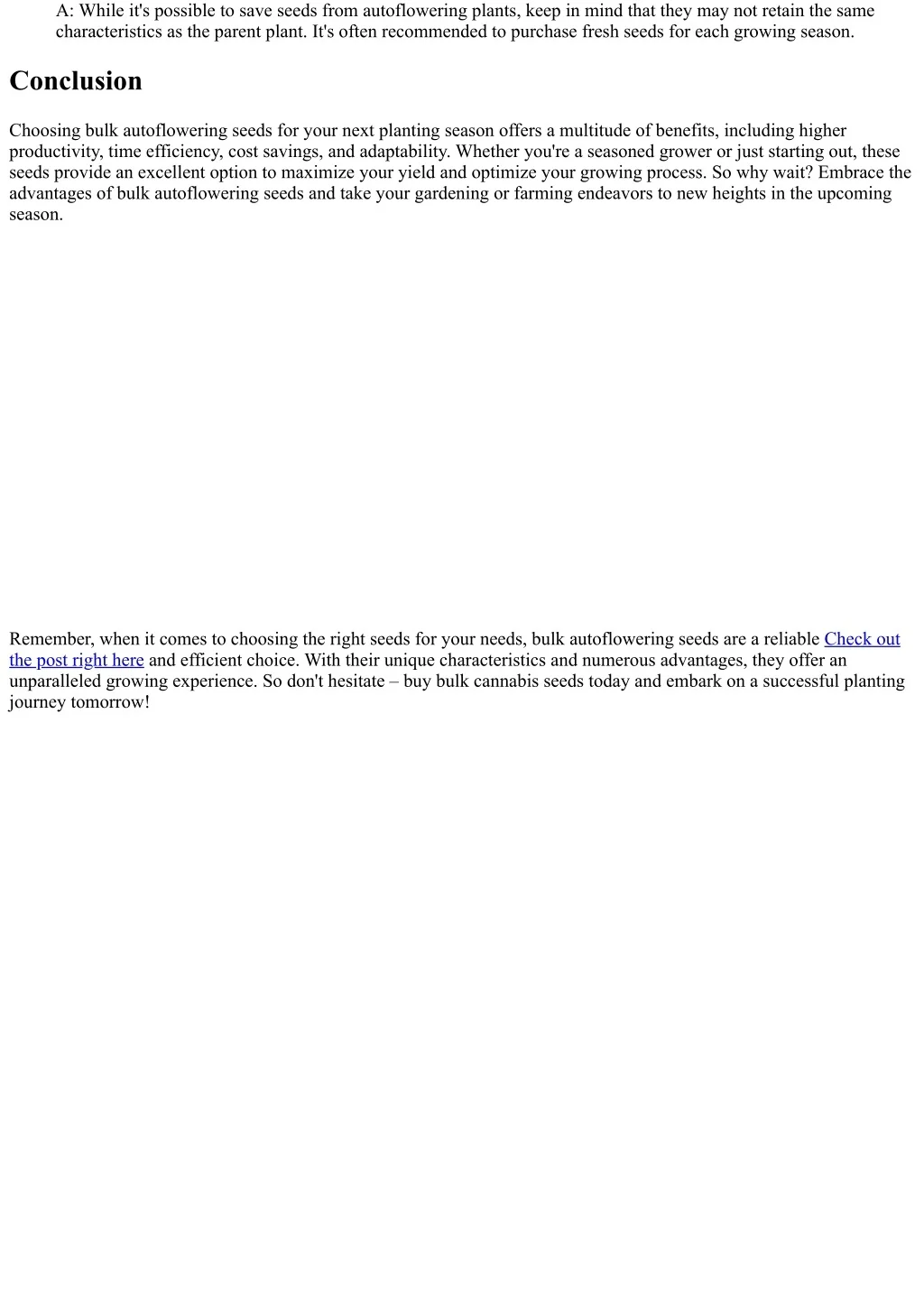 A: While it's possible to save seeds from autoflowering plants, keep in mind that they may not retain the same characteristics as the parent plant. It's often recommended to purchase fresh seeds for each growing season. Conclusion Choosing bulk autoflowering seeds for your next planting season offers a multitude of benefits, including higher productivity, time efficiency, cost savings, and adaptability. Whether you're a seasoned grower or just starting out, these seeds provide an excellent option to maximize your yield and optimize your growing process. So why wait? Embrace the advantages of bulk autoflowering seeds and take your gardening or farming endeavors to new heights in the upcoming season. Remember, when it comes to choosing the right seeds for your needs, bulk autoflowering seeds are a reliable Check out the post right here and efficient choice. With their unique characteristics and numerous advantages, they offer an unparalleled growing experience. So don't hesitate – buy bulk cannabis seeds today and embark on a successful planting journey tomorrow!