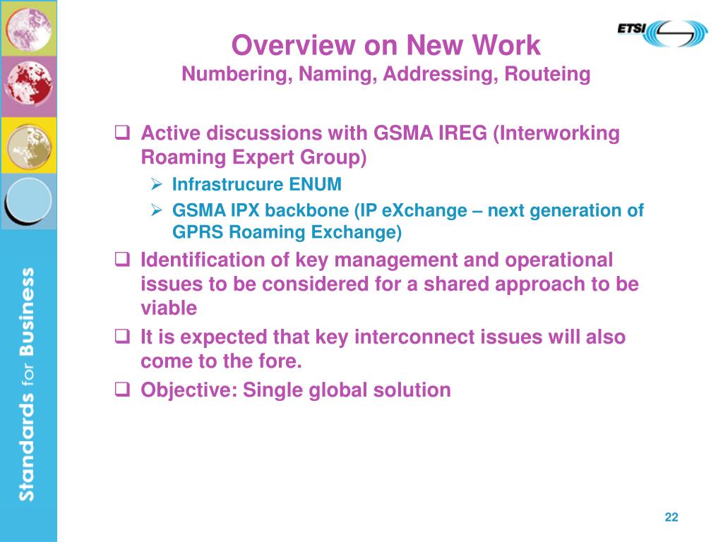 Overview on New WorkNumbering, Naming, Addressing, Routeing • Active discussions with GSMA IREG (Interworking Roaming Expert Group) • Infrastrucure ENUM • GSMA IPX backbone (IP eXchange – next generation of GPRS Roaming Exchange) • Identification of key management and operational issues to be considered for a shared approach to be viable • It is expected that key interconnect issues will also come to the fore. • Objective: Single global solution