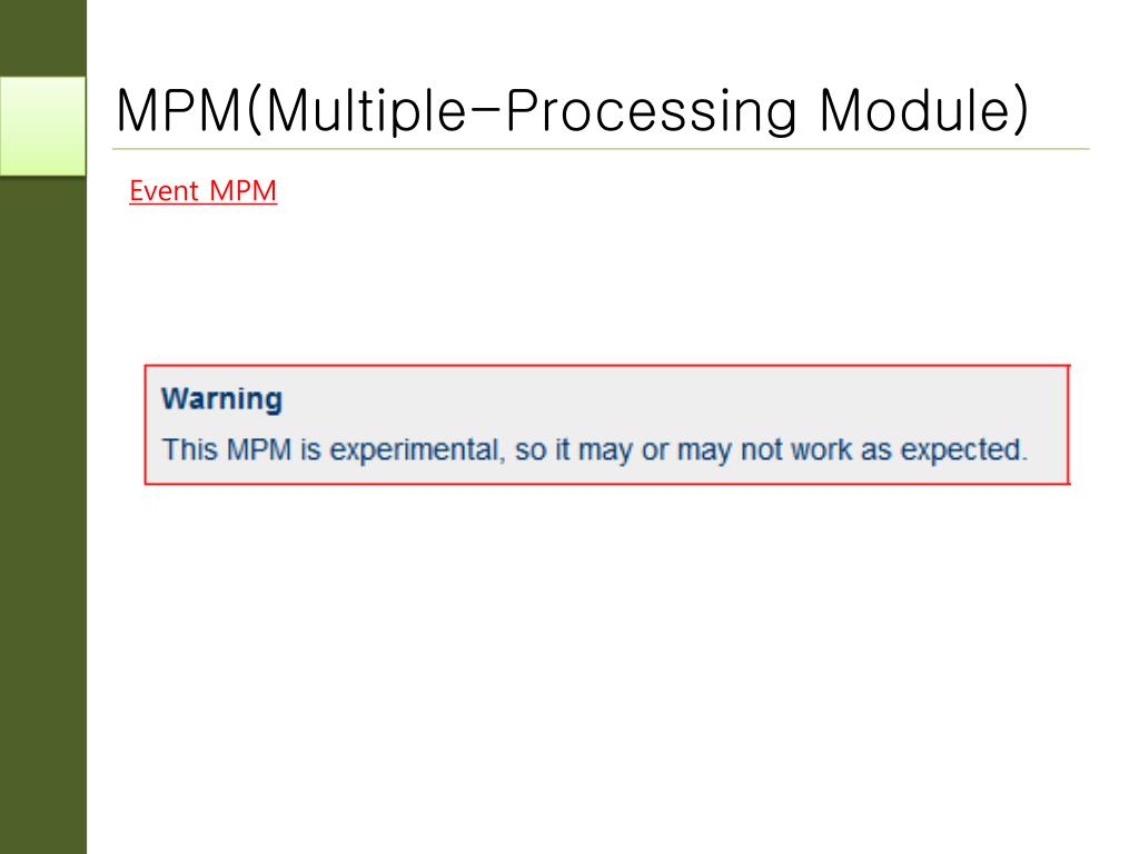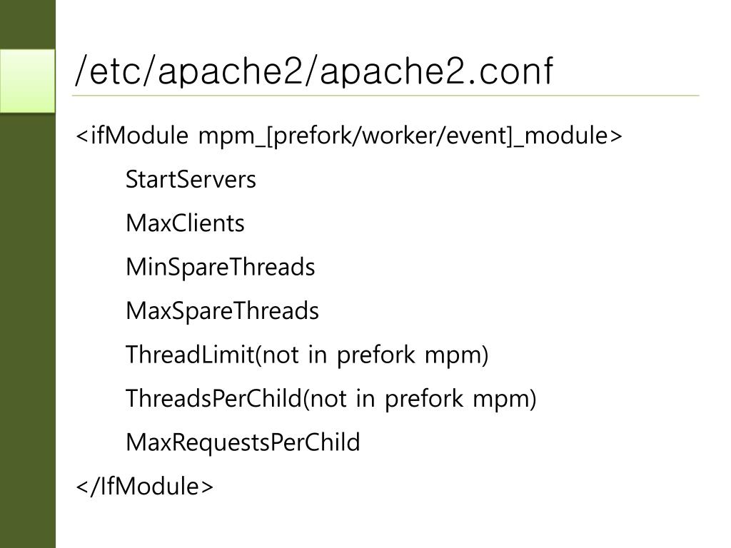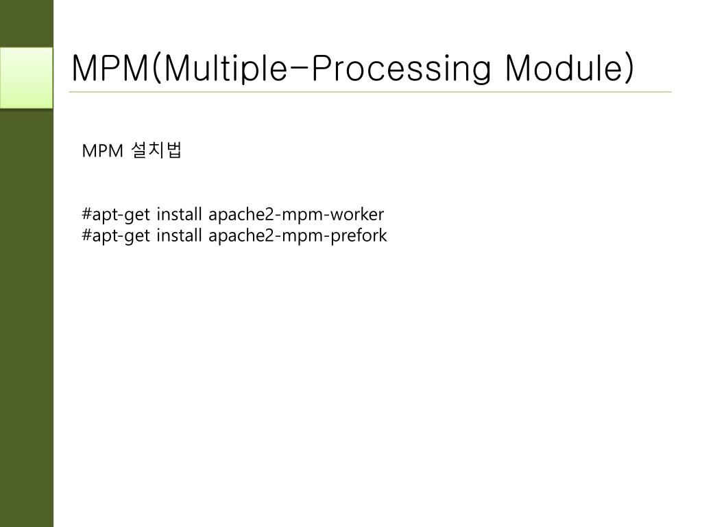 MPM(Multiple-Processing Module) MPM 설치법 #apt-get install apache2-mpm-worker #apt-get install apache2-mpm-prefork