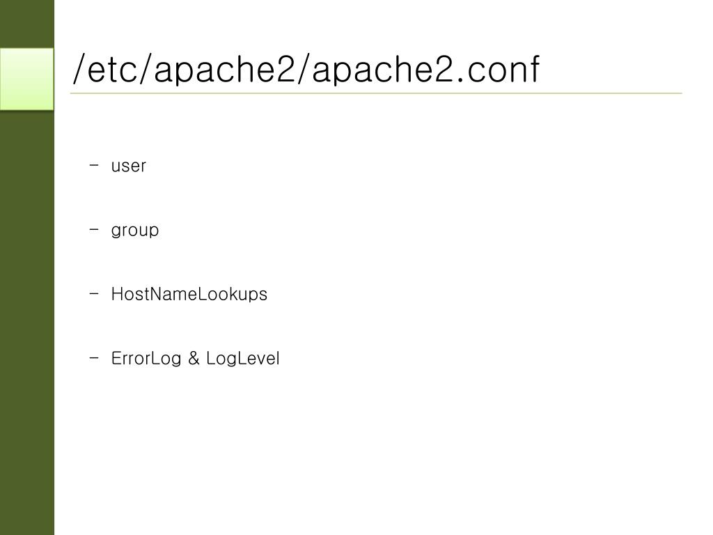 /etc/apache2/apache2.conf • user • group • HostNameLookups • ErrorLog & LogLevel