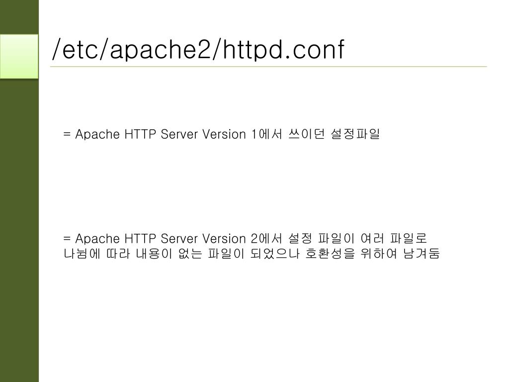 /etc/apache2/httpd.conf = Apache HTTP Server Version 1에서 쓰이던 설정파일 = Apache HTTP Server Version 2에서 설정 파일이 여러 파일로 나뉨에 따라 내용이 없는 파일이 되었으나 호환성을 위하여 남겨둠