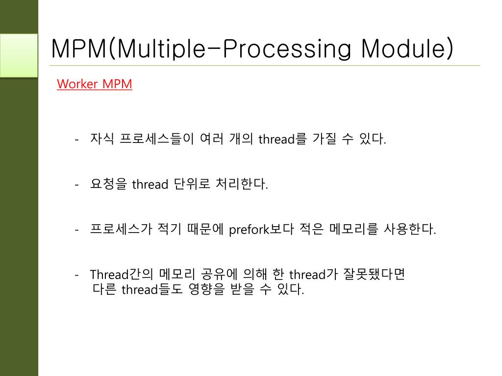 MPM(Multiple-Processing Module) Worker MPM • 자식 프로세스들이 여러 개의 thread를 가질 수 있다. • 요청을 thread 단위로 처리한다. • 프로세스가 적기 때문에 prefork보다 적은 메모리를 사용한다. • Thread간의 메모리 공유에 의해 한 thread가 잘못됐다면 • 다른 thread들도 영향을 받을 수 있다.