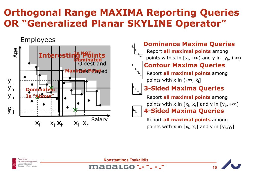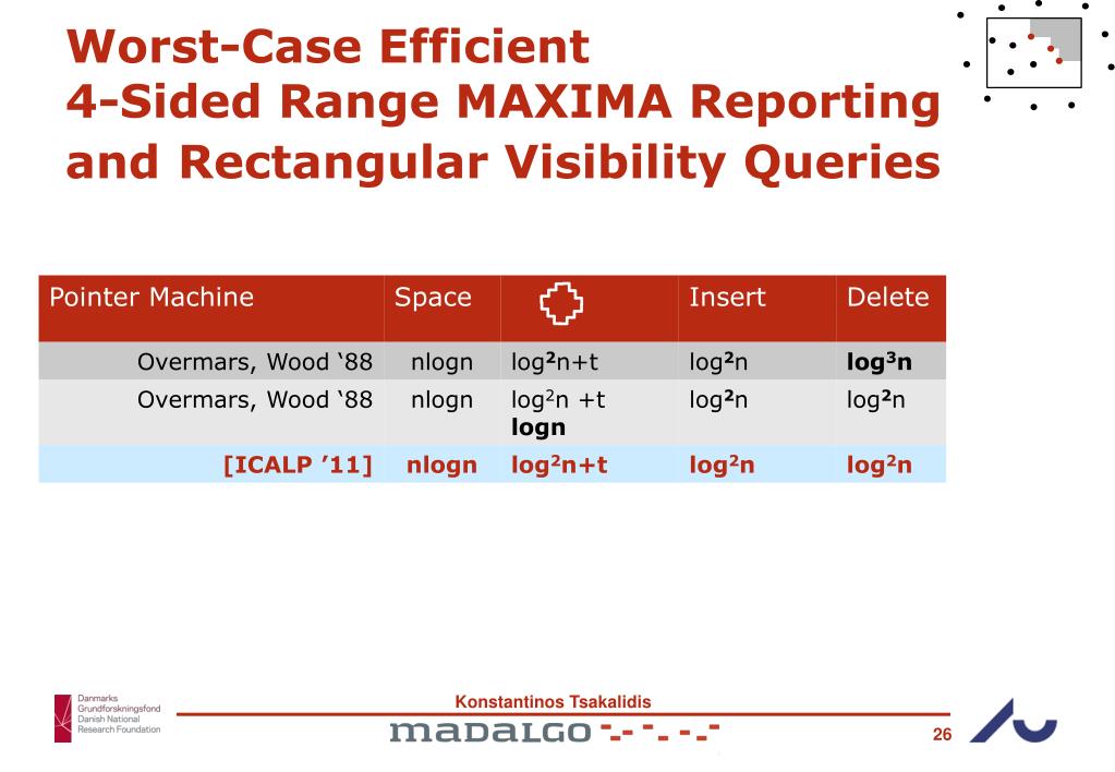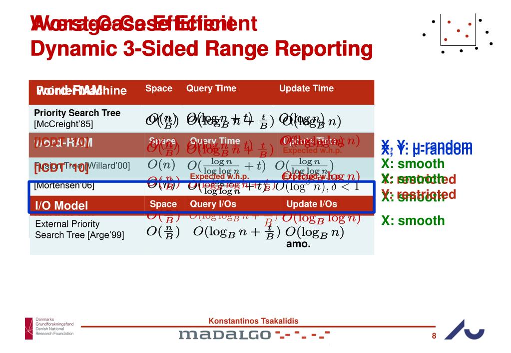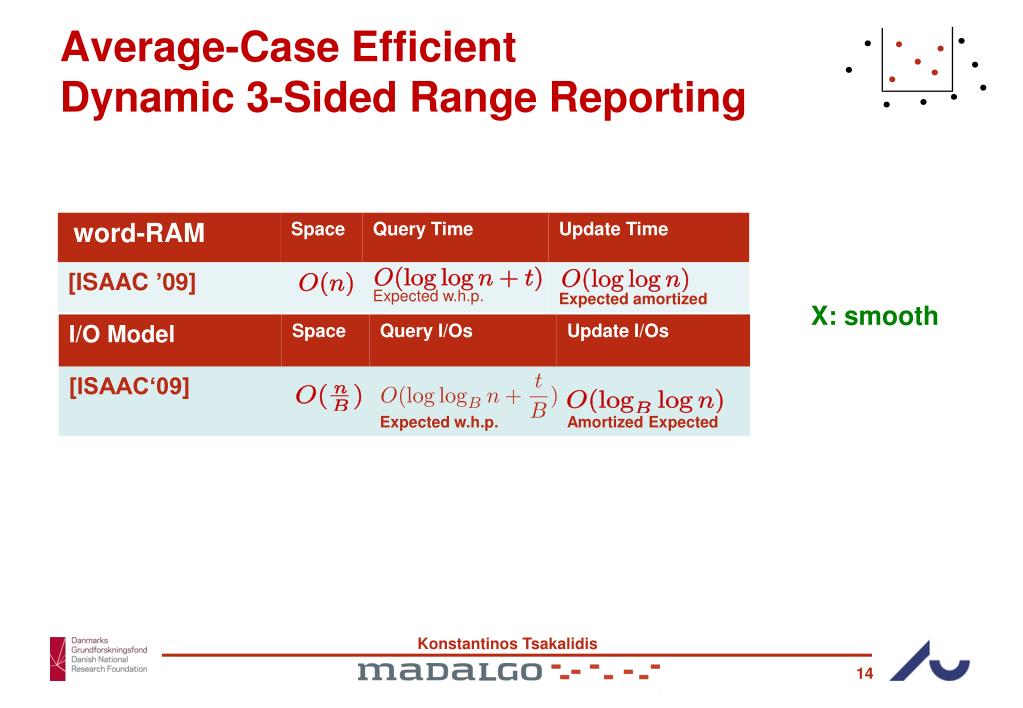 Tsakalidis K., et al. [ISAAC ‘09]“Dynamic 3-Sided Planar Range Queries with Expected Doubly Logarithmic Time”[ICDT ’10]“Efficient Processing of 3-Sided Range Queries with Probabilistic Guarantees”[ICALP ’11]“Dynamic Planar Range Maxima Queries”[SODA ‘12]“Fully Persistent B-Trees” Mange TakKonstantinosTsakalidisPh.D. Studenttsakalid@madalgo.au.dk
