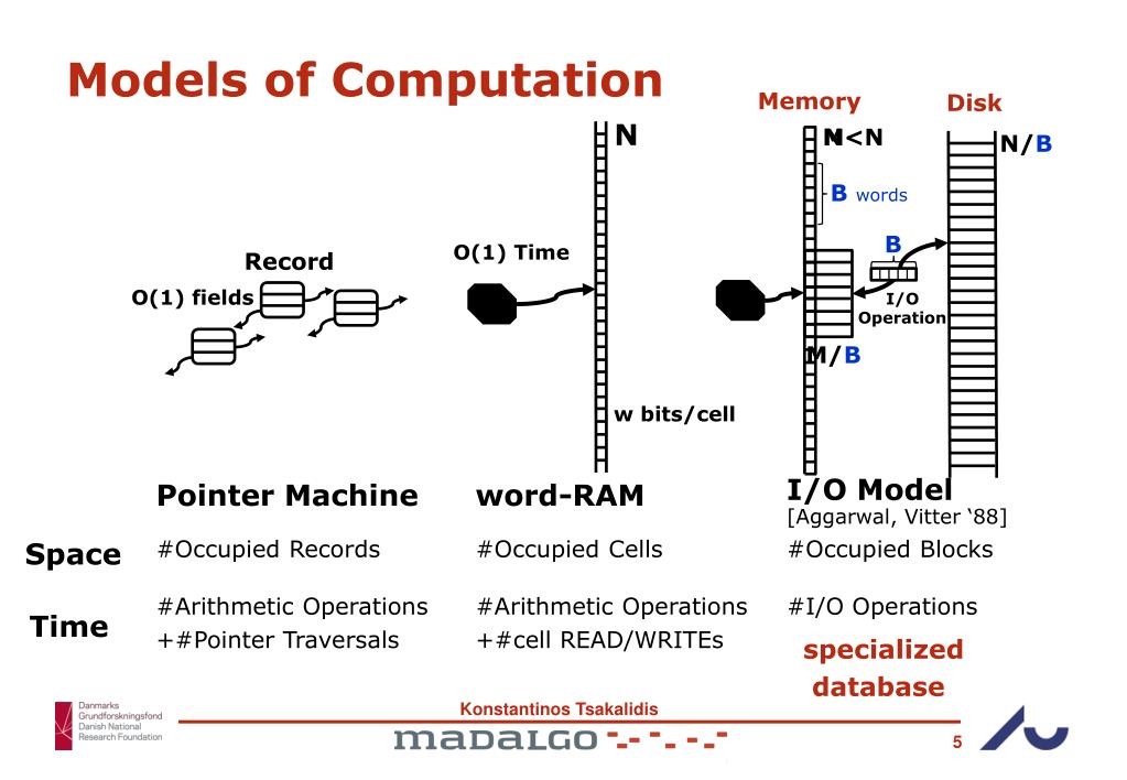 Models of Computation Memory Disk N M<N N/B B words N B Record O(1) fields I/O Operation M/B O(1) Time I/O Model [Aggarwal, Vitter ‘88] Pointer Machine word-RAM #Occupied Records #Occupied Cells #Occupied Blocks Space #Arithmetic Operations +#Pointer Traversals #Arithmetic Operations +#cell READ/WRITEs #I/O Operations w bits/cell Time specialized database