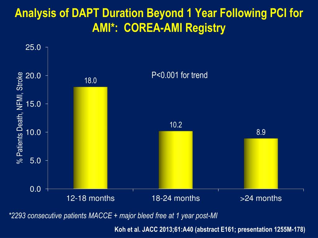 Analysis of DAPT Duration Beyond 1 Year Following PCI for AMI*: COREA-AMI Registry *2293 consecutive patients MACCE + major bleed free at 1 year post-MI Koh et al. JACC 2013;61:A40 (abstract E161; presentation 1255M-178)