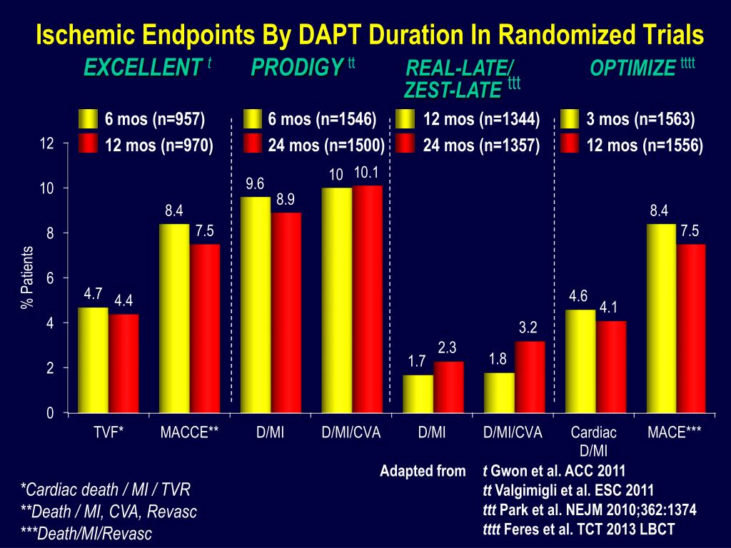 Ischemic Endpoints By DAPT Duration In Randomized Trials EXCELLENT t PRODIGY ttREAL-LATE/ OPTIMIZE tttt ZEST-LATEttt 6 mos(n=957) 6 mos (n=1546) 12 mos (n=1344) 3 mos (n=1563) 12 mos (n=970) 24 mos (n=1500) 24 mos (n=1357) 12 mos (n=1556) Adapted from tGwon et al. ACC 2011 ttValgimigli et al. ESC 2011 ttt Park et al. NEJM 2010;362:1374 ttttFeres et al. TCT 2013 LBCT *Cardiac death / MI / TVR **Death / MI, CVA, Revasc ***Death/MI/Revasc