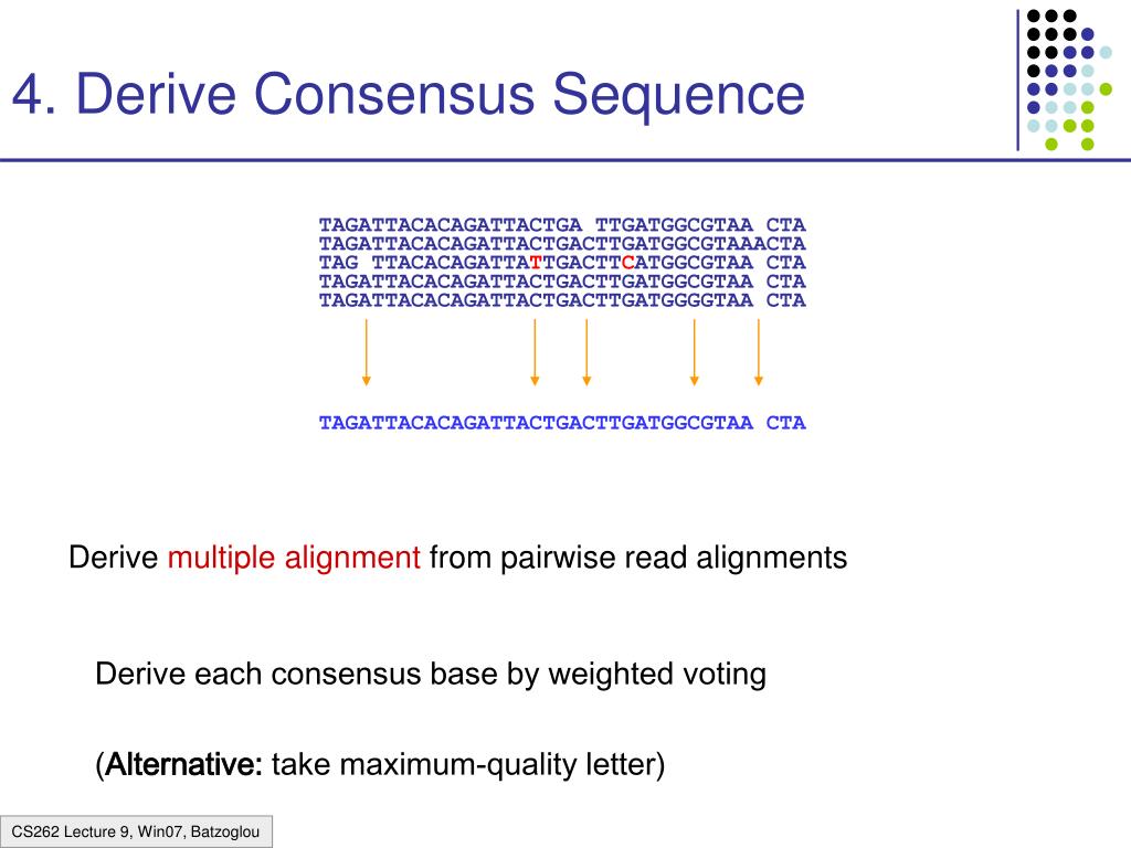 4. Derive Consensus Sequence TAGATTACACAGATTACTGA TTGATGGCGTAA CTA Derive multiple alignment from pairwise read alignments TAGATTACACAGATTACTGACTTGATGGCGTAAACTA TAG TTACACAGATTATTGACTTCATGGCGTAA CTA TAGATTACACAGATTACTGACTTGATGGCGTAA CTA TAGATTACACAGATTACTGACTTGATGGGGTAA CTA TAGATTACACAGATTACTGACTTGATGGCGTAA CTA Derive each consensus base by weighted voting (Alternative: take maximum-quality letter)