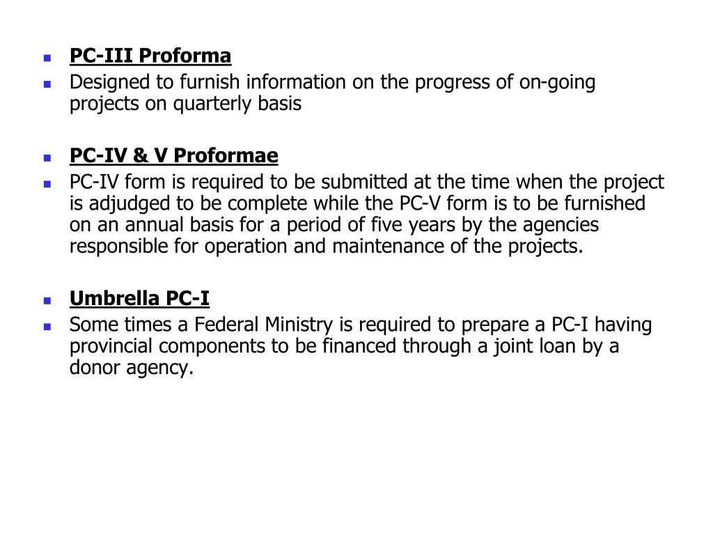 PC-III Proforma • Designed to furnish information on the progress of on-going projects on quarterly basis • PC-IV & V Proformae • PC-IV form is required to be submitted at the time when the project is adjudged to be complete while the PC-V form is to be furnished on an annual basis for a period of five years by the agencies responsible for operation and maintenance of the projects. • Umbrella PC-I • Some times a Federal Ministry is required to prepare a PC-I having provincial components to be financed through a joint loan by a donor agency.