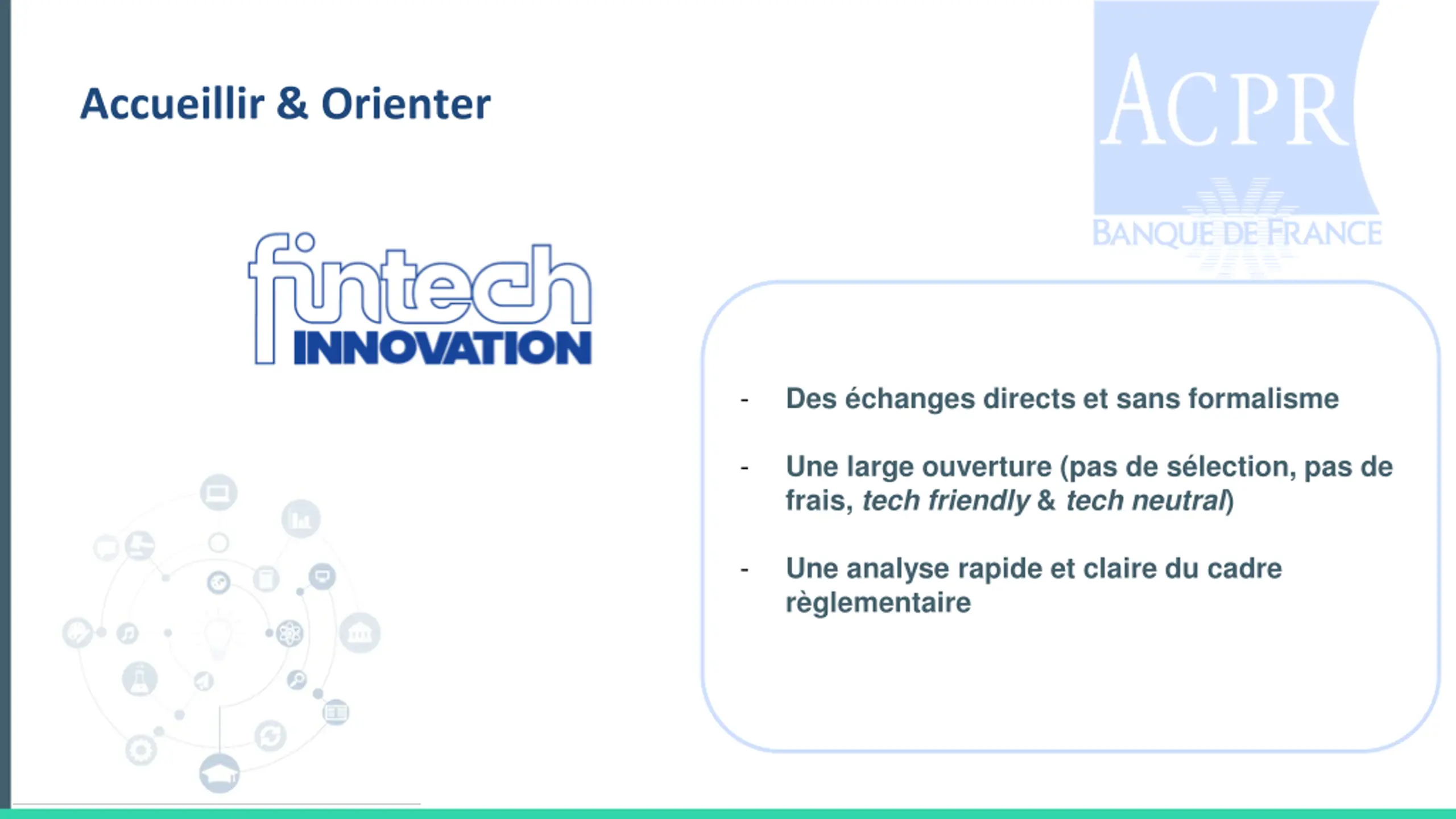 Accueillir & Orienter - Des échanges directs et sans formalisme - Une large ouverture (pas de sélection, pas de frais, tech friendly & tech neutral) - Une analyse rapide et claire du cadre règlementaire