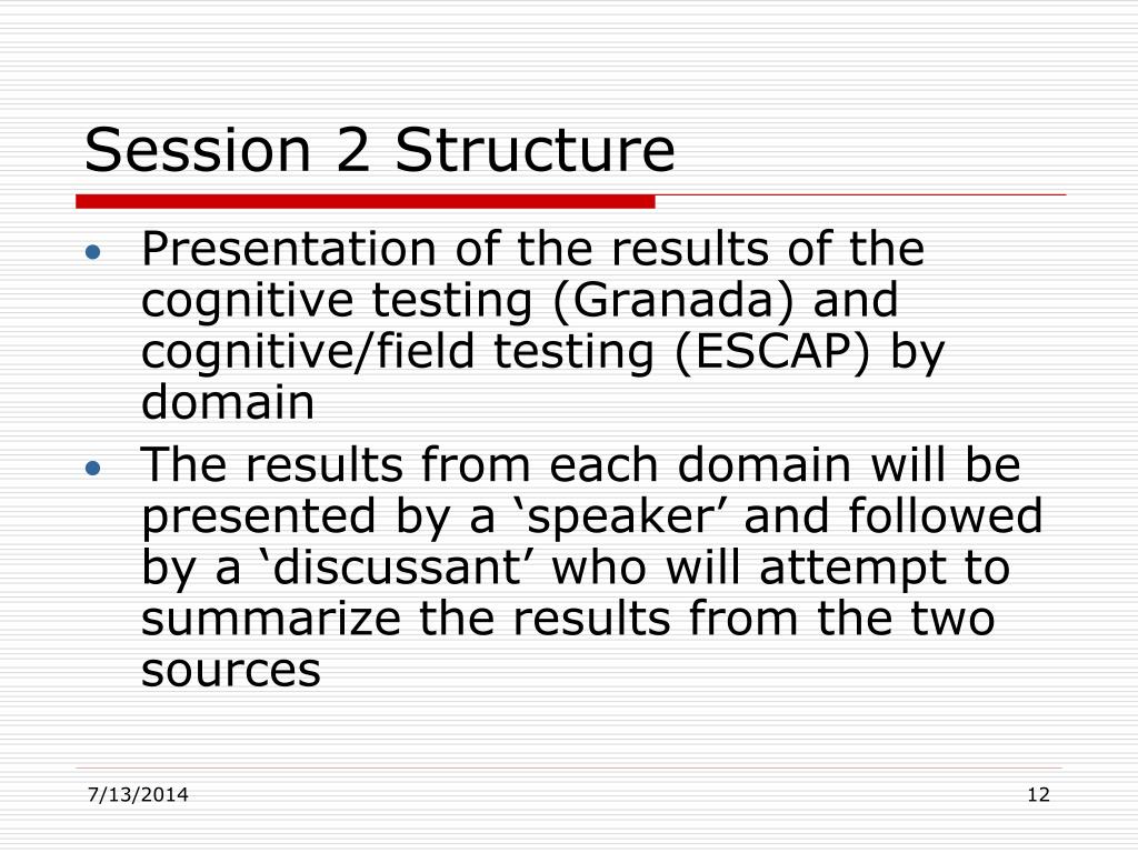 Session 2 Structure • Presentation of the results of the cognitive testing (Granada) and cognitive/field testing (ESCAP) by domain • The results from each domain will be presented by a ‘speaker’ and followed by a ‘discussant’ who will attempt to summarize the results from the two sources