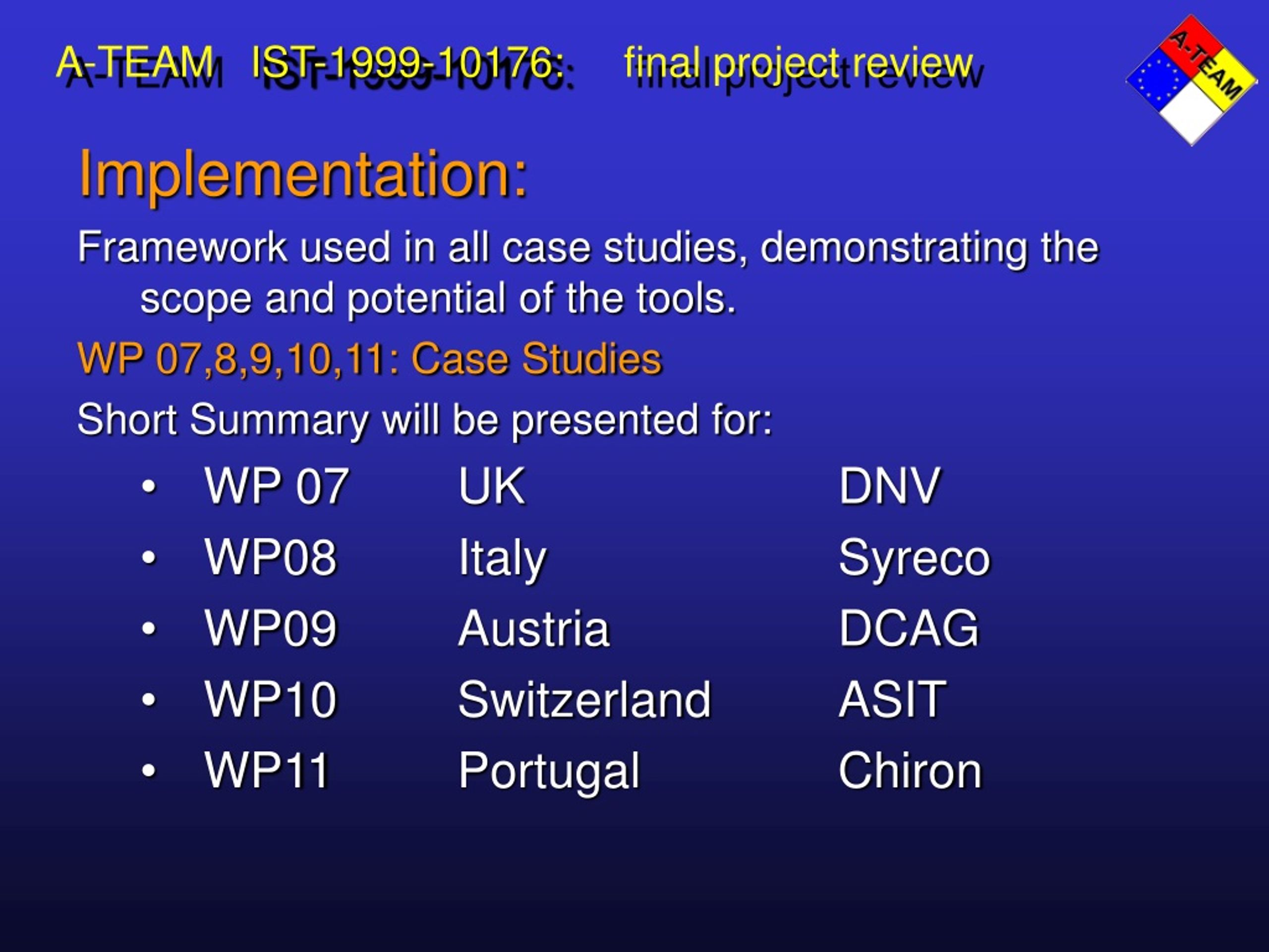 Implementation: Framework used in all case studies, demonstrating the scope and potential of the tools. WP 07,8,9,10,11: Case Studies Short Summary will be presented for: • WP 07 UK DNV • WP08 Italy Syreco • WP09 Austria DCAG • WP10 Switzerland ASIT • WP11 Portugal Chiron
