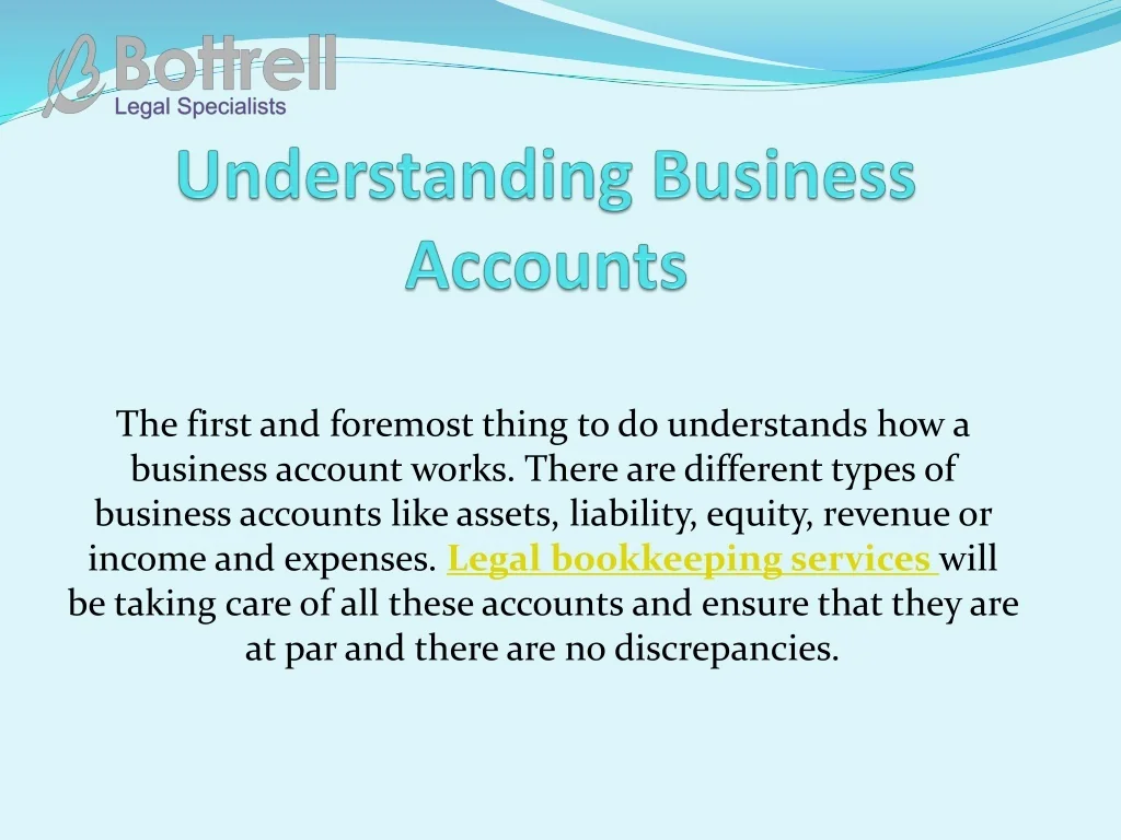 The first and foremost thing to do understands how a business account works. There are different types of business accounts like assets, liability, equity, revenue or income and expenses. Legal bookkeeping services will be taking care of all these accounts and ensure that they are at par and there are no discrepancies.