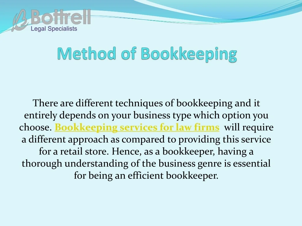 Bookkeeping play important role to manage finance and accounting of legal firm. Bottrell legal has expert team of professional bookkeepers who offers best bookkeeping for lawyers. To know complete guide for legal bookkeeping service, have a look on this Presentation.