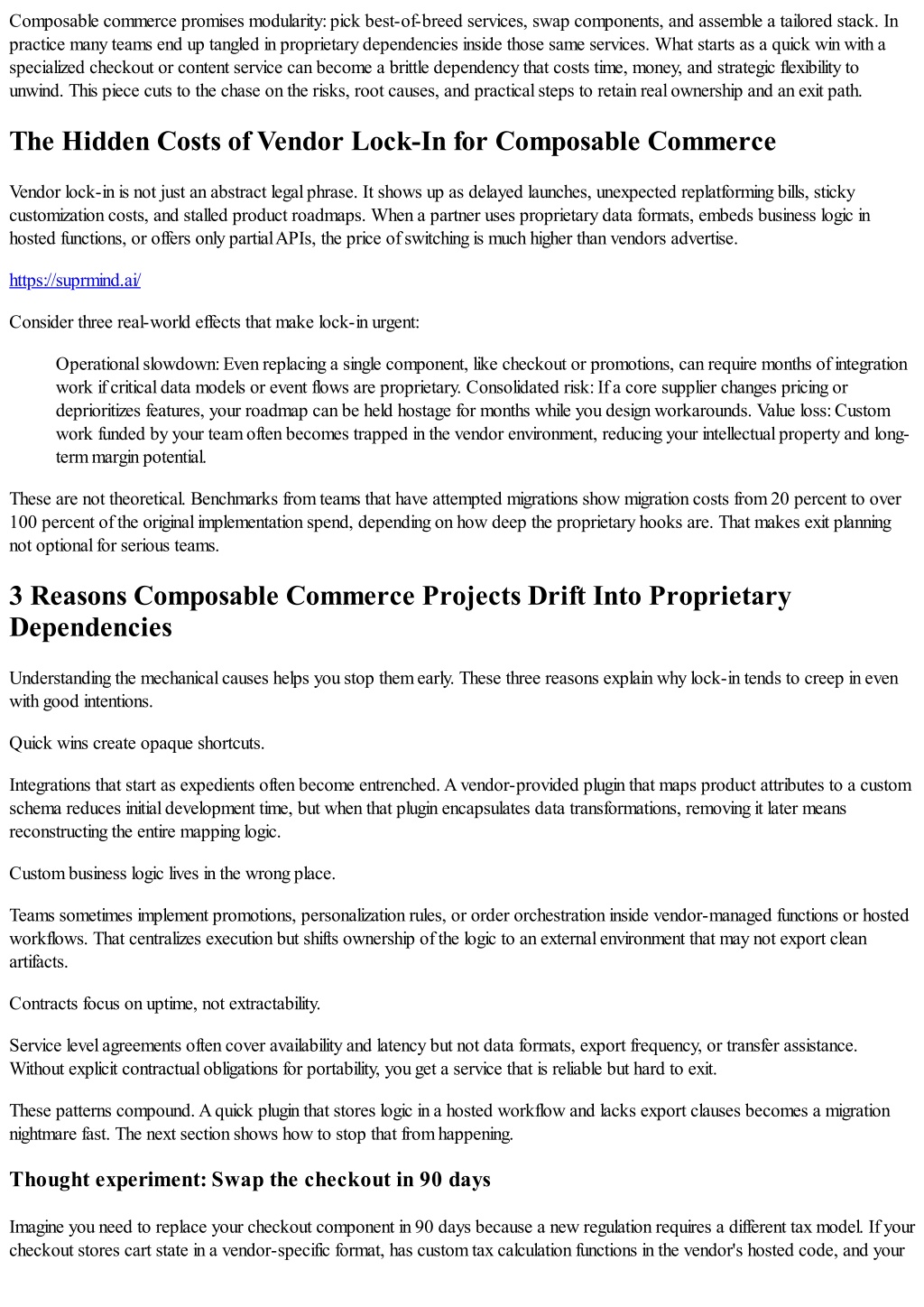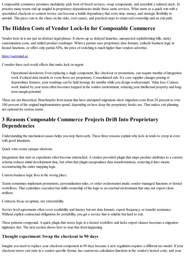 Composable commerce promises modularity: pick best-of-breed services, swap components, and assemble a tailored stack. In practice many teams end up tangled in proprietary dependencies inside those same services. What starts as a quick win with a specialized checkout or content service can become a brittle dependency that costs time, money, and strategic flexibility to unwind. This piece cuts to the chase on the risks, root causes, and practical steps to retain real ownership and an exit path. The Hidden Costs of Vendor Lock-In for Composable Commerce Vendor lock-in is not just an abstract legal phrase. It shows up as delayed launches, unexpected replatforming bills, sticky customization costs, and stalled product roadmaps. When a partner uses proprietary data formats, embeds business logic in hosted functions, or offers only partial APIs, the price of switching is much higher than vendors advertise. https://suprmind.ai/ Consider three real-world effects that make lock-in urgent: Operational slowdown: Even replacing a single component, like checkout or promotions, can require months of integration work if critical data models or event flows are proprietary. Consolidated risk: If a core supplier changes pricing or deprioritizes features, your roadmap can be held hostage for months while you design workarounds. Value loss: Custom work funded by your team often becomes trapped in the vendor environment, reducing your intellectual property and long- term margin potential. These are not theoretical. Benchmarks from teams that have attempted migrations show migration costs from 20 percent to over 100 percent of the original implementation spend, depending on how deep the proprietary hooks are. That makes exit planning not optional for serious teams. 3 Reasons Composable Commerce Projects Drift Into Proprietary Dependencies Understanding the mechanical causes helps you stop them early. These three reasons explain why lock-in tends to creep in even with good intentions. Quick wins create opaque shortcuts. Integrations that start as expedients often become entrenched. A vendor-provided plugin that maps product attributes to a custom schema reduces initial development time, but when that plugin encapsulates data transformations, removing it later means reconstructing the entire mapping logic. Custom business logic lives in the wrong place. Teams sometimes implement promotions, personalization rules, or order orchestration inside vendor-managed functions or hosted workflows. That centralizes execution but shifts ownership of the logic to an external environment that may not export clean artifacts. Contracts focus on uptime, not extractability. Service level agreements often cover availability and latency but not data formats, export frequency, or transfer assistance. Without explicit contractual obligations for portability, you get a service that is reliable but hard to exit. These patterns compound. A quick plugin that stores logic in a hosted workflow and lacks export clauses becomes a migration nightmare fast. The next section shows how to stop that from happening. Thought experiment: Swap the checkout in 90 days Imagine you need to replace your checkout component in 90 days because a new regulation requires a different tax model. If your checkout stores cart state in a vendor-specific format, has custom tax calculation functions in the vendor's hosted code, and your
