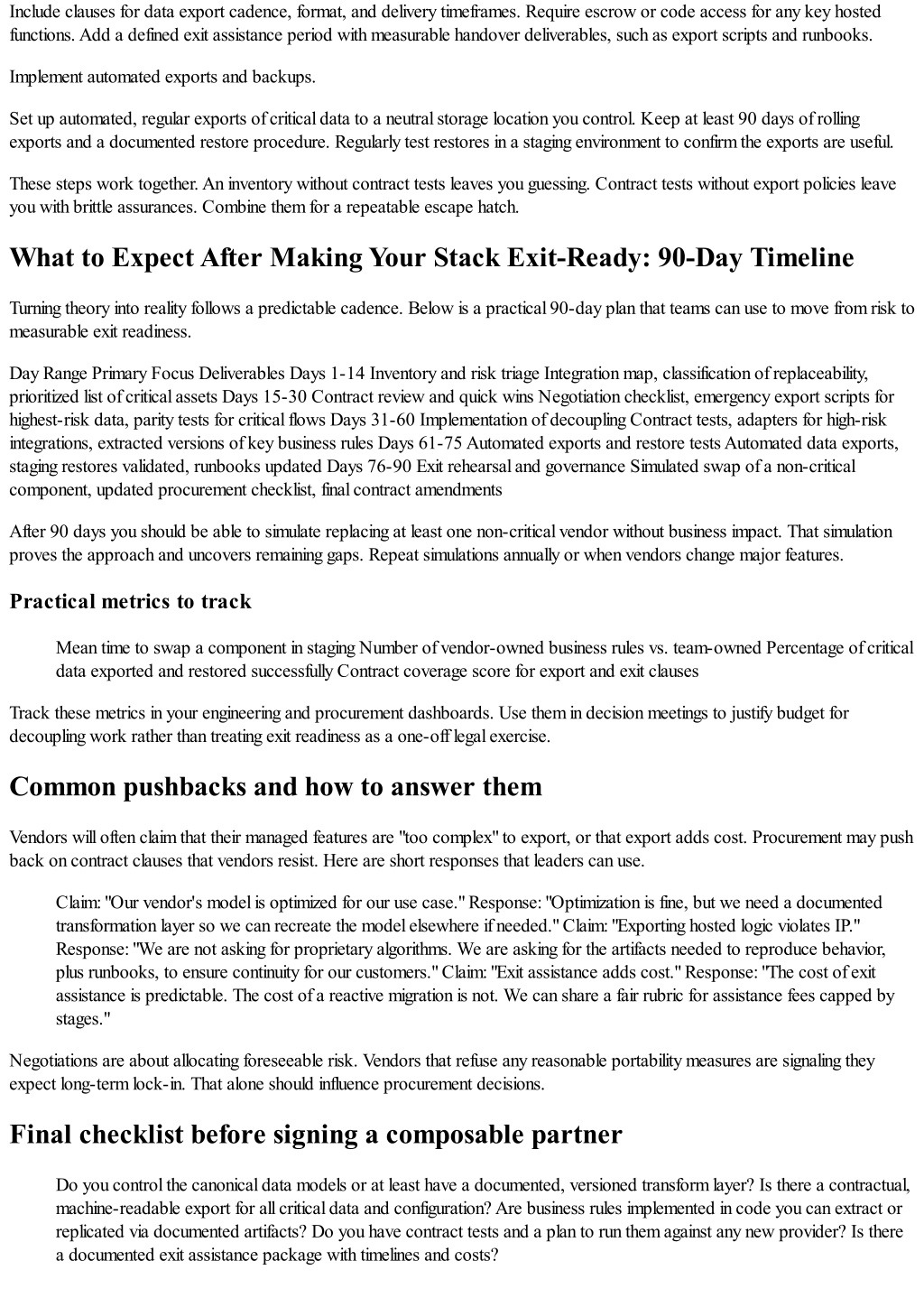 Include clauses for data export cadence, format, and delivery timeframes. Require escrow or code access for any key hosted functions. Add a defined exit assistance period with measurable handover deliverables, such as export scripts and runbooks. Implement automated exports and backups. Set up automated, regular exports of critical data to a neutral storage location you control. Keep at least 90 days of rolling exports and a documented restore procedure. Regularly test restores in a staging environment to confirm the exports are useful. These steps work together. An inventory without contract tests leaves you guessing. Contract tests without export policies leave you with brittle assurances. Combine them for a repeatable escape hatch. What to Expect After Making Your Stack Exit-Ready: 90-Day Timeline Turning theory into reality follows a predictable cadence. Below is a practical 90-day plan that teams can use to move from risk to measurable exit readiness. Day Range Primary Focus Deliverables Days 1-14 Inventory and risk triage Integration map, classification of replaceability, prioritized list of critical assets Days 15-30 Contract review and quick wins Negotiation checklist, emergency export scripts for highest-risk data, parity tests for critical flows Days 31-60 Implementation of decoupling Contract tests, adapters for high-risk integrations, extracted versions of key business rules Days 61-75 Automated exports and restore tests Automated data exports, staging restores validated, runbooks updated Days 76-90 Exit rehearsal and governance Simulated swap of a non-critical component, updated procurement checklist, final contract amendments After 90 days you should be able to simulate replacing at least one non-critical vendor without business impact. That simulation proves the approach and uncovers remaining gaps. Repeat simulations annually or when vendors change major features. Practical metrics to track Mean time to swap a component in staging Number of vendor-owned business rules vs. team-owned Percentage of critical data exported and restored successfully Contract coverage score for export and exit clauses Track these metrics in your engineering and procurement dashboards. Use them in decision meetings to justify budget for decoupling work rather than treating exit readiness as a one-off legal exercise. Common pushbacks and how to answer them Vendors will often claim that their managed features are "too complex" to export, or that export adds cost. Procurement may push back on contract clauses that vendors resist. Here are short responses that leaders can use. Claim: "Our vendor's model is optimized for our use case." Response: "Optimization is fine, but we need a documented transformation layer so we can recreate the model elsewhere if needed." Claim: "Exporting hosted logic violates IP." Response: "We are not asking for proprietary algorithms. We are asking for the artifacts needed to reproduce behavior, plus runbooks, to ensure continuity for our customers." Claim: "Exit assistance adds cost." Response: "The cost of exit assistance is predictable. The cost of a reactive migration is not. We can share a fair rubric for assistance fees capped by stages." Negotiations are about allocating foreseeable risk. Vendors that refuse any reasonable portability measures are signaling they expect long-term lock-in. That alone should influence procurement decisions. Final checklist before signing a composable partner Do you control the canonical data models or at least have a documented, versioned transform layer? Is there a contractual, machine-readable export for all critical data and configuration? Are business rules implemented in code you can extract or replicated via documented artifacts? Do you have contract tests and a plan to run them against any new provider? Is there a documented exit assistance package with timelines and costs?
