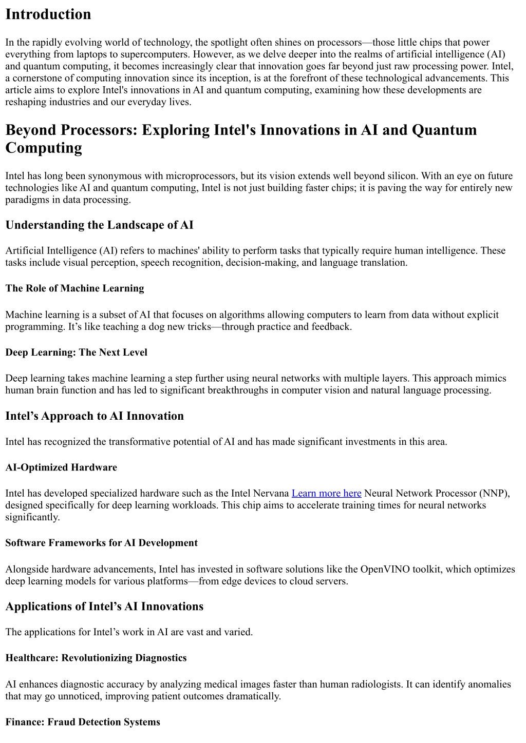 Introduction In the rapidly evolving world of technology, the spotlight often shines on processors—those little chips that power everything from laptops to supercomputers. However, as we delve deeper into the realms of artificial intelligence (AI) and quantum computing, it becomes increasingly clear that innovation goes far beyond just raw processing power. Intel, a cornerstone of computing innovation since its inception, is at the forefront of these technological advancements. This article aims to explore Intel's innovations in AI and quantum computing, examining how these developments are reshaping industries and our everyday lives. Beyond Processors: Exploring Intel's Innovations in AI and Quantum Computing Intel has long been synonymous with microprocessors, but its vision extends well beyond silicon. With an eye on future technologies like AI and quantum computing, Intel is not just building faster chips; it is paving the way for entirely new paradigms in data processing. Understanding the Landscape of AI Artificial Intelligence (AI) refers to machines' ability to perform tasks that typically require human intelligence. These tasks include visual perception, speech recognition, decision-making, and language translation. The Role of Machine Learning Machine learning is a subset of AI that focuses on algorithms allowing computers to learn from data without explicit programming. It’s like teaching a dog new tricks—through practice and feedback. Deep Learning: The Next Level Deep learning takes machine learning a step further using neural networks with multiple layers. This approach mimics human brain function and has led to significant breakthroughs in computer vision and natural language processing. Intel’s Approach to AI Innovation Intel has recognized the transformative potential of AI and has made significant investments in this area. AI-Optimized Hardware Intel has developed specialized hardware such as the Intel Nervana Learn more here Neural Network Processor (NNP), designed specifically for deep learning workloads. This chip aims to accelerate training times for neural networks significantly. Software Frameworks for AI Development Alongside hardware advancements, Intel has invested in software solutions like the OpenVINO toolkit, which optimizes deep learning models for various platforms—from edge devices to cloud servers. Applications of Intel’s AI Innovations The applications for Intel’s work in AI are vast and varied. Healthcare: Revolutionizing Diagnostics AI enhances diagnostic accuracy by analyzing medical images faster than human radiologists. It can identify anomalies that may go unnoticed, improving patient outcomes dramatically. Finance: Fraud Detection Systems