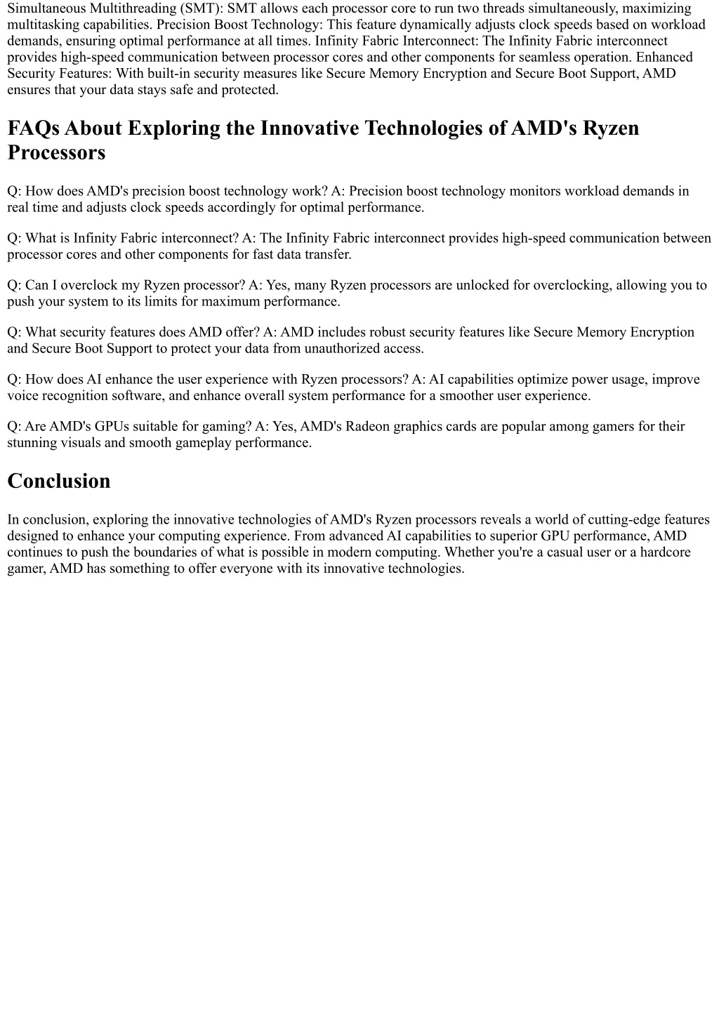 Simultaneous Multithreading (SMT): SMT allows each processor core to run two threads simultaneously, maximizing multitasking capabilities. Precision Boost Technology: This feature dynamically adjusts clock speeds based on workload demands, ensuring optimal performance at all times. Infinity Fabric Interconnect: The Infinity Fabric interconnect provides high-speed communication between processor cores and other components for seamless operation. Enhanced Security Features: With built-in security measures like Secure Memory Encryption and Secure Boot Support, AMD ensures that your data stays safe and protected. FAQs About Exploring the Innovative Technologies of AMD's Ryzen Processors Q: How does AMD's precision boost technology work? A: Precision boost technology monitors workload demands in real time and adjusts clock speeds accordingly for optimal performance. Q: What is Infinity Fabric interconnect? A: The Infinity Fabric interconnect provides high-speed communication between processor cores and other components for fast data transfer. Q: Can I overclock my Ryzen processor? A: Yes, many Ryzen processors are unlocked for overclocking, allowing you to push your system to its limits for maximum performance. Q: What security features does AMD offer? A: AMD includes robust security features like Secure Memory Encryption and Secure Boot Support to protect your data from unauthorized access. Q: How does AI enhance the user experience with Ryzen processors? A: AI capabilities optimize power usage, improve voice recognition software, and enhance overall system performance for a smoother user experience. Q: Are AMD's GPUs suitable for gaming? A: Yes, AMD's Radeon graphics cards are popular among gamers for their stunning visuals and smooth gameplay performance. Conclusion In conclusion, exploring the innovative technologies of AMD's Ryzen processors reveals a world of cutting-edge features designed to enhance your computing experience. From advanced AI capabilities to superior GPU performance, AMD continues to push the boundaries of what is possible in modern computing. Whether you're a casual user or a hardcore gamer, AMD has something to offer everyone with its innovative technologies.