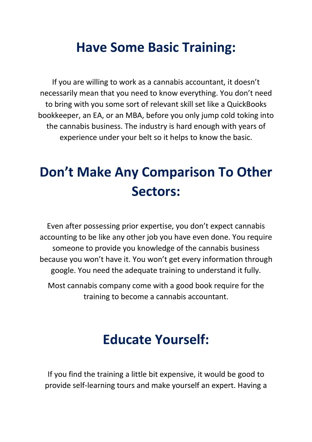 Have Some Basic Training: If you are willing to work as a cannabis accountant, it doesn’t necessarily mean that you need to know everything. You don’t need to bring with you some sort of relevant skill set like a QuickBooks bookkeeper, an EA, or an MBA, before you only jump cold toking into the cannabis business. The industry is hard enough with years of experience under your belt so it helps to know the basic. Don’t Make Any Comparison To Other Sectors: Even after possessing prior expertise, you don’t expect cannabis accounting to be like any other job you have even done. You require someone to provide you knowledge of the cannabis business because you won’t have it. You won’t get every information through google. You need the adequate training to understand it fully. Most cannabis company come with a good book require for the training to become a cannabis accountant. Educate Yourself: If you find the training a little bit expensive, it would be good to provide self-learning tours and make yourself an expert. Having a