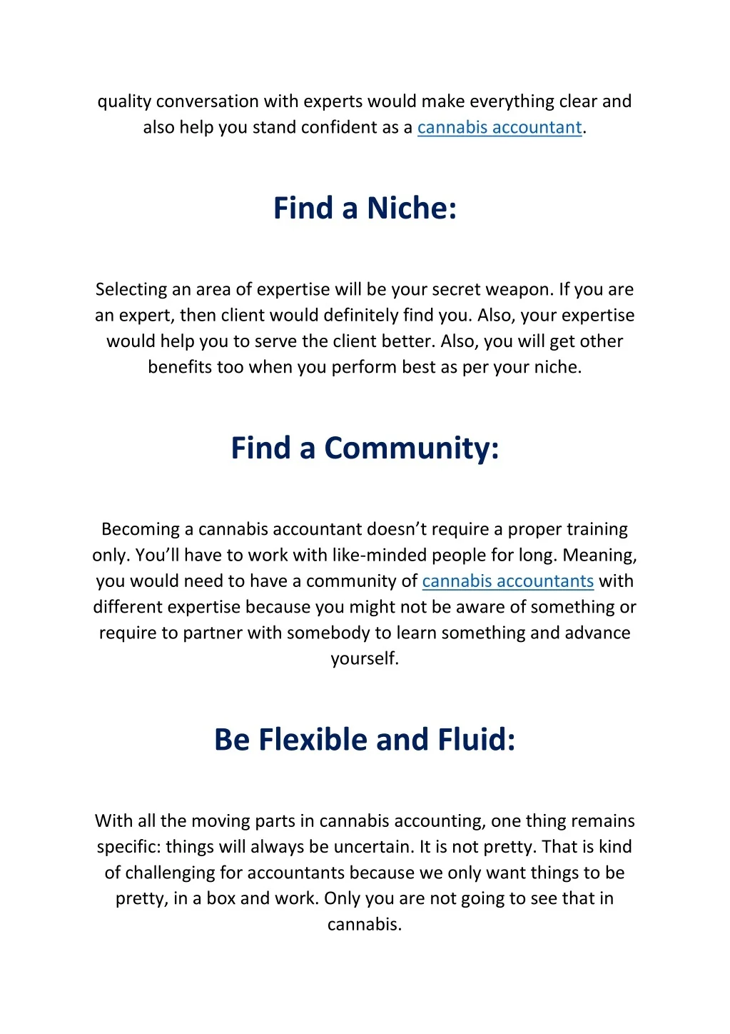 quality conversation with experts would make everything clear and also help you stand confident as a cannabis accountant. Find a Niche: Selecting an area of expertise will be your secret weapon. If you are an expert, then client would definitely find you. Also, your expertise would help you to serve the client better. Also, you will get other benefits too when you perform best as per your niche. Find a Community: Becoming a cannabis accountant doesn’t require a proper training only. You’ll have to work with like-minded people for long. Meaning, you would need to have a community of cannabis accountants with different expertise because you might not be aware of something or require to partner with somebody to learn something and advance yourself. Be Flexible and Fluid: With all the moving parts in cannabis accounting, one thing remains specific: things will always be uncertain. It is not pretty. That is kind of challenging for accountants because we only want things to be pretty, in a box and work. Only you are not going to see that in cannabis.