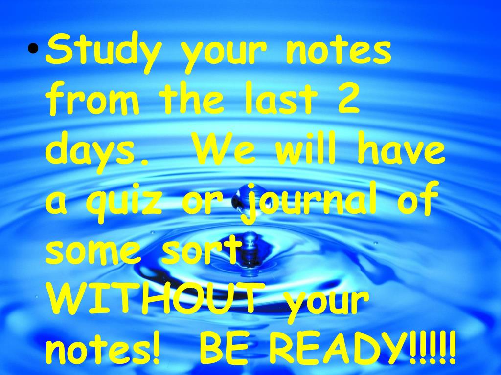 Study your notes from the last 2 days. We will have a quiz or journal of some sort WITHOUT your notes! BE READY!!!!!