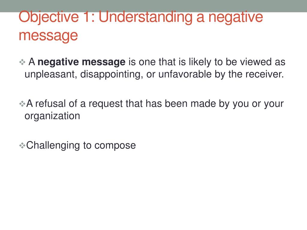 Objective 1: Understanding a negative message • A negative message is one that is likely to be viewed as unpleasant, disappointing, or unfavorable by the receiver. • A refusal of a request that has been made by you or your organization • Challenging to compose