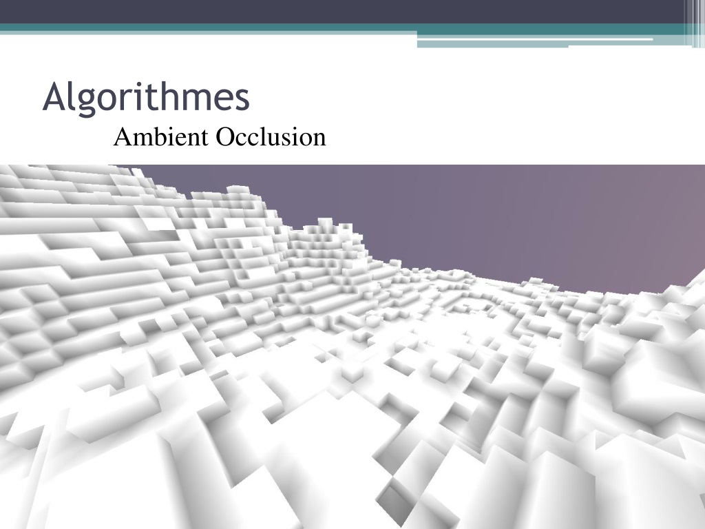 Algorithmes • Bruit de Perlin • Terrain • Affichagedes faces • Ambient Occlusion Premier « vrai » rendu