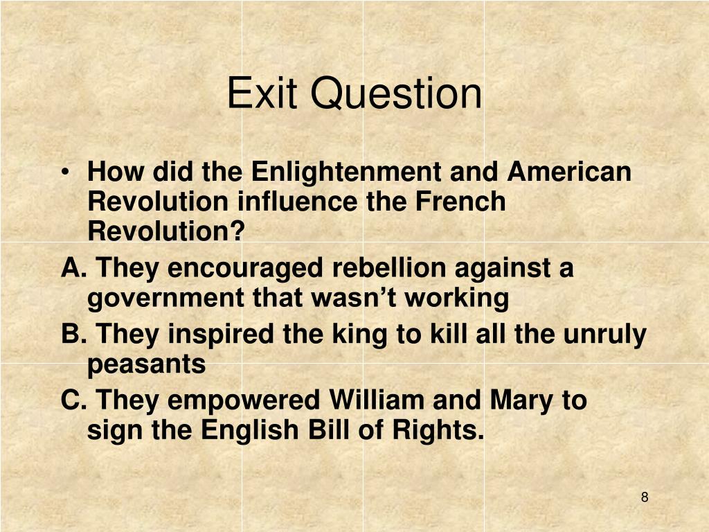 Exit Question • How did the Enlightenment and American Revolution influence the French Revolution? A. They encouraged rebellion against a government that wasn’t working B. They inspired the king to kill all the unruly peasants C. They empowered William and Mary to sign the English Bill of Rights.