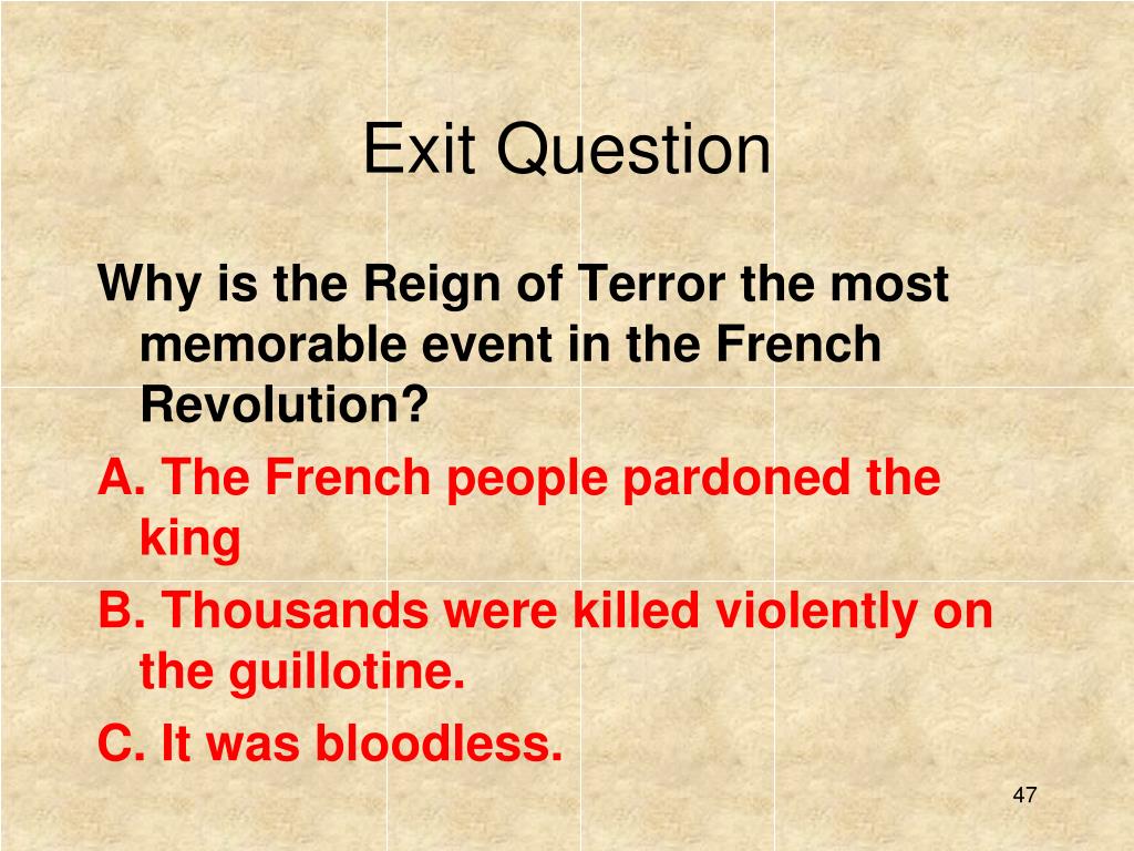 Exit Question Why is the Reign of Terror the most memorable event in the French Revolution? A. The French people pardoned the king B. Thousands were killed violently on the guillotine. C. It was bloodless.